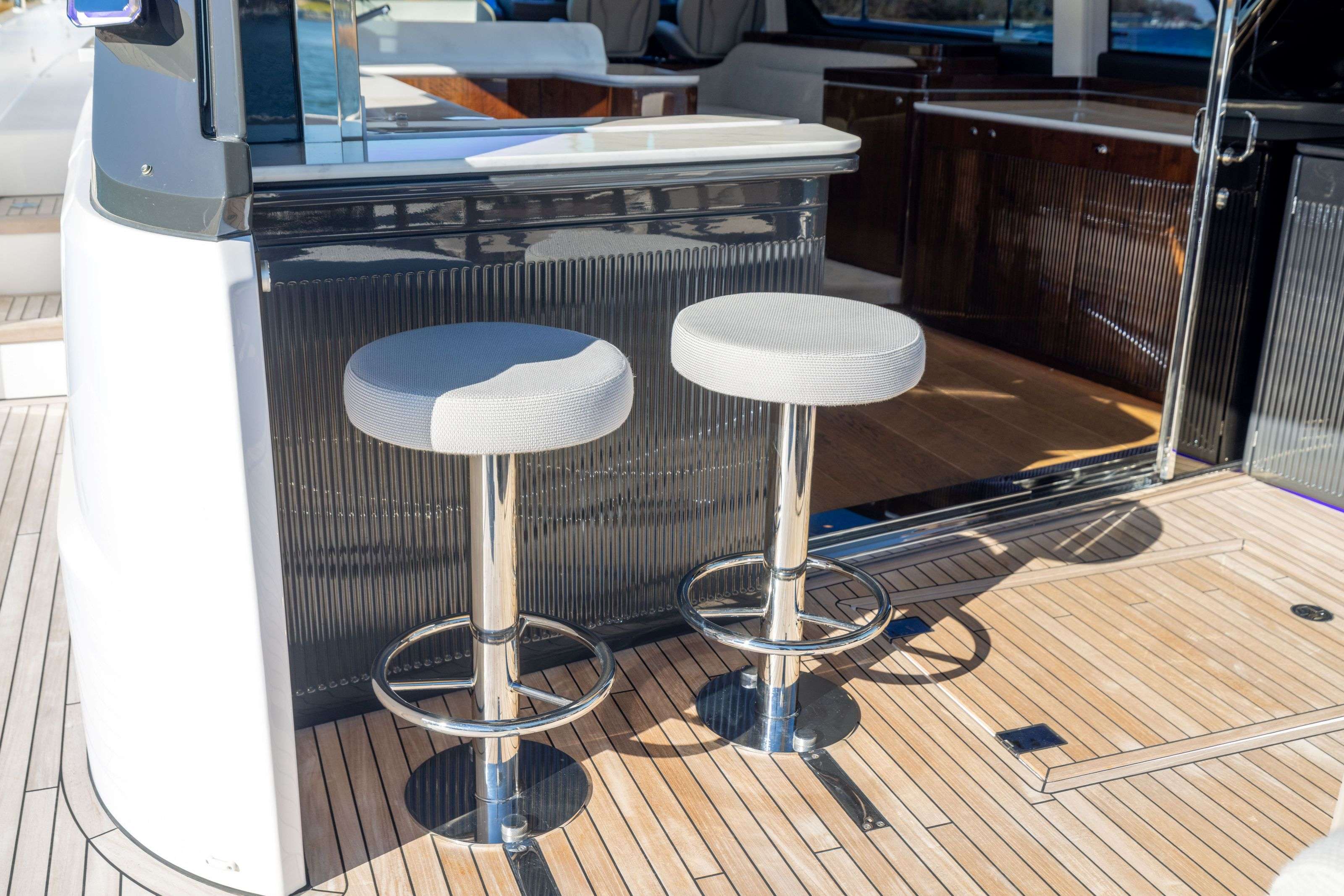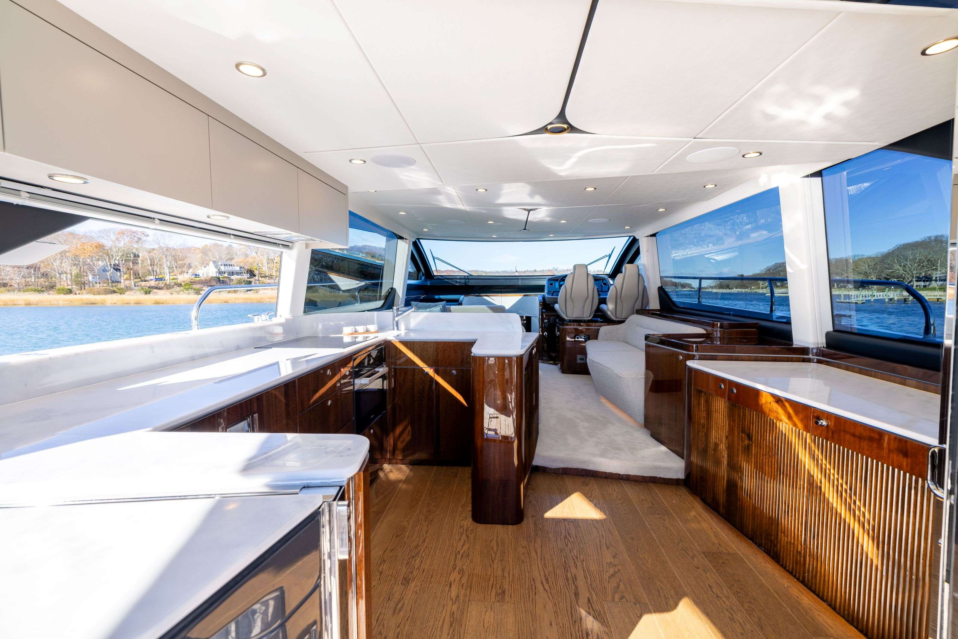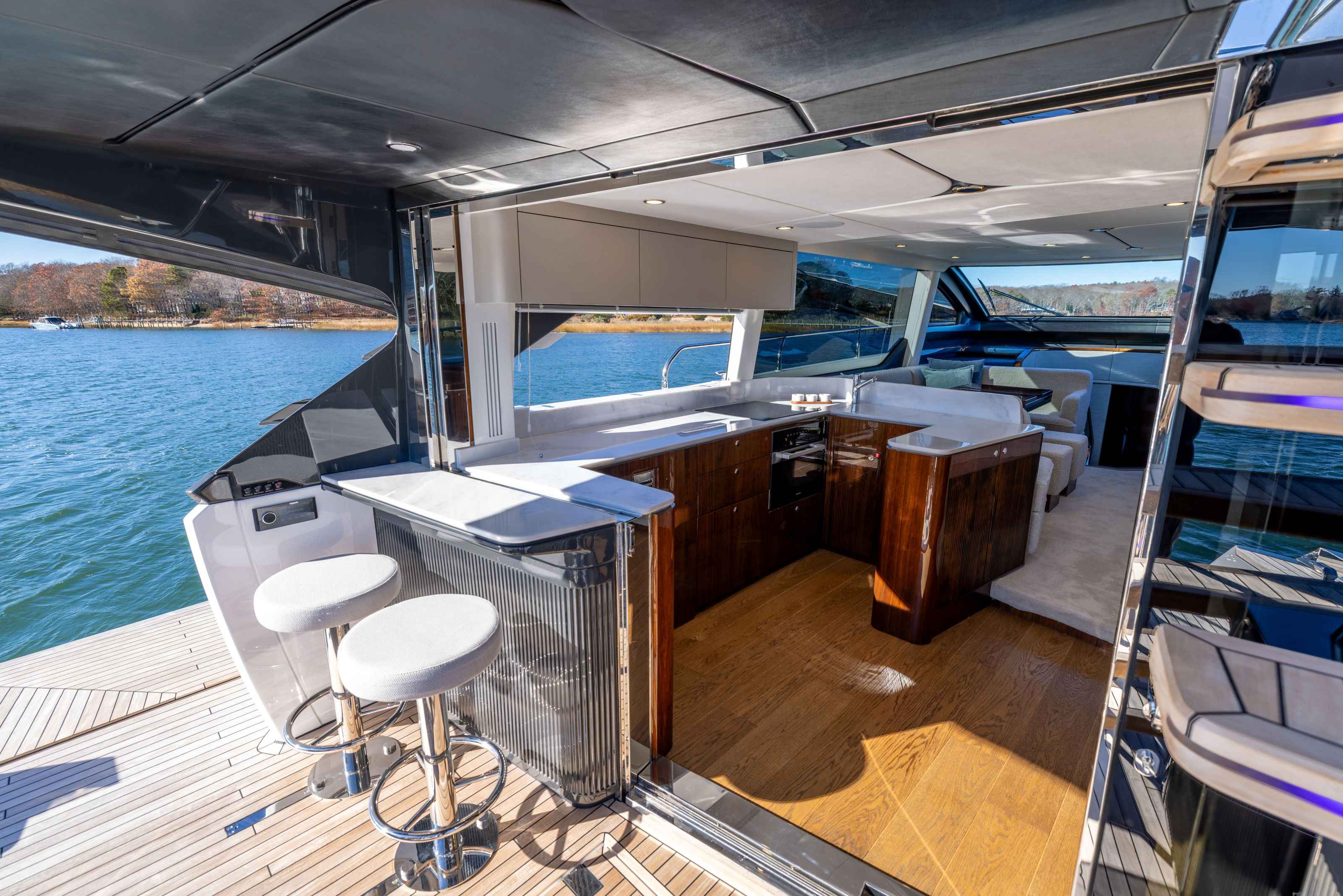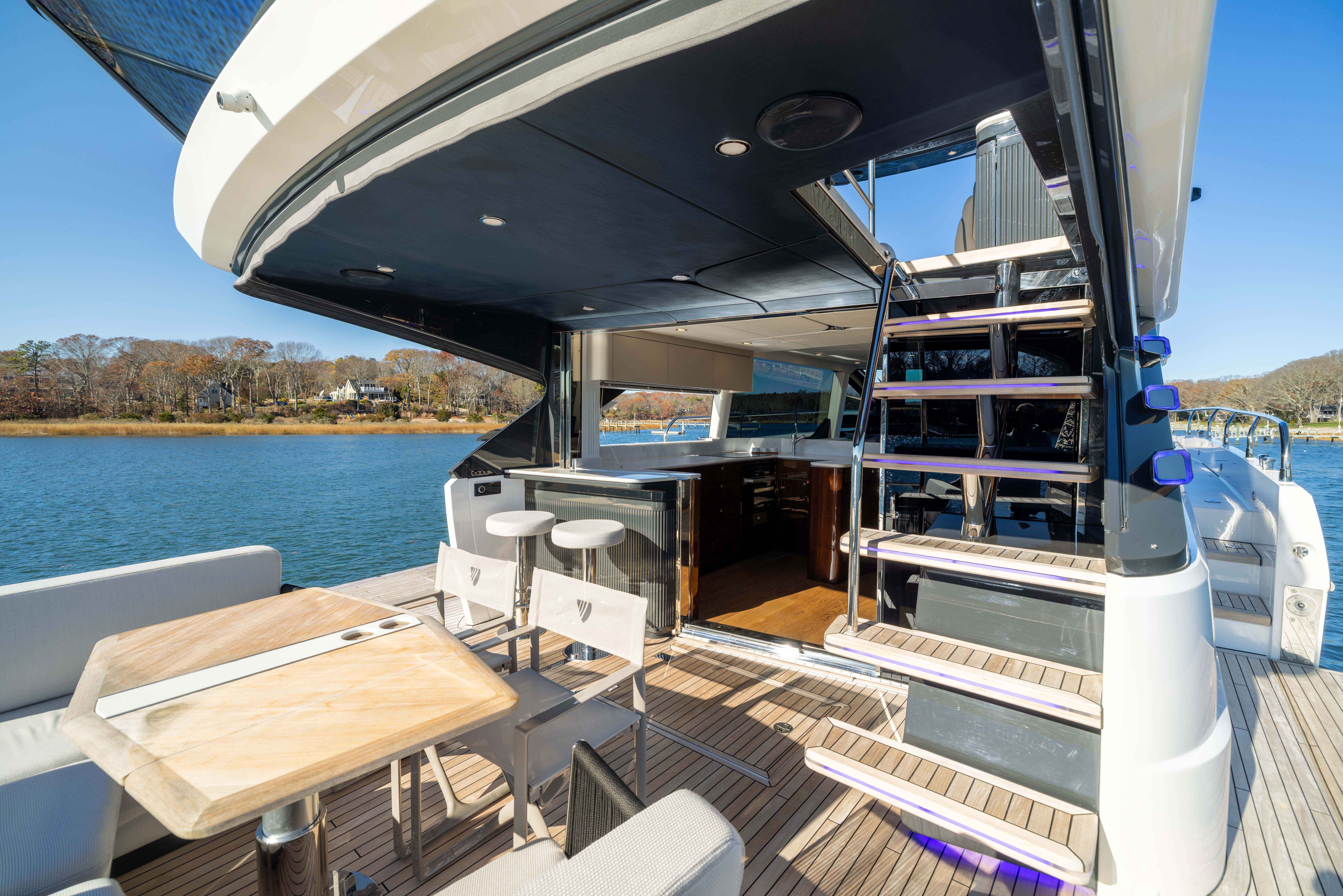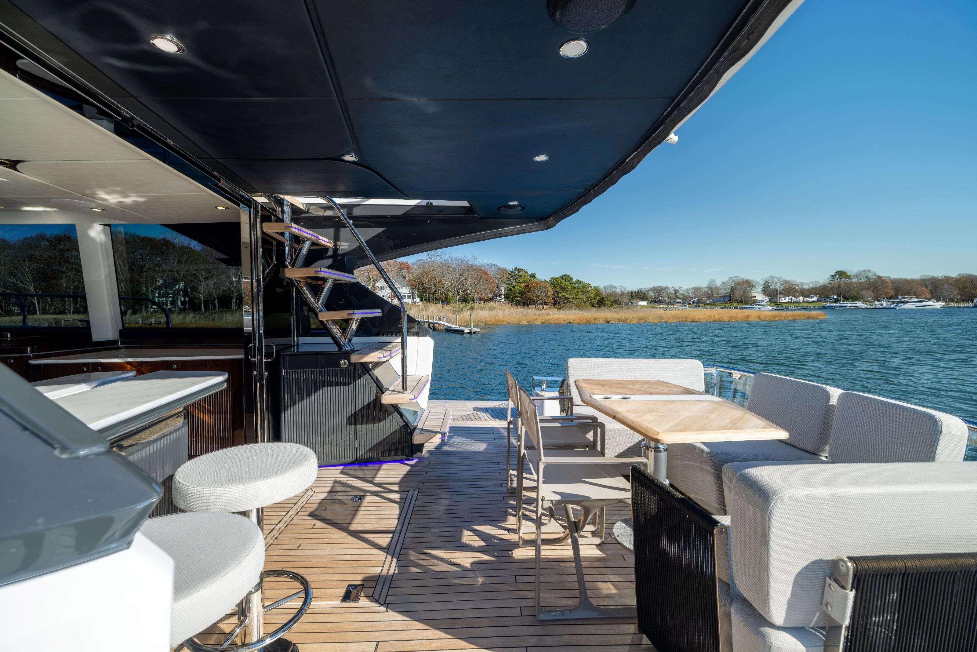 The expansive flybridge provides multiple seating and sunbathing options, all styled to integrate together to create that all important flow and balance while sheltering under the opening hardtop. The rakish exterior lines are both dynamic and elegant that preserve the timeless look of a Squadron, while the three fins adorn the panoramic saloon windows as its badge of distinction.