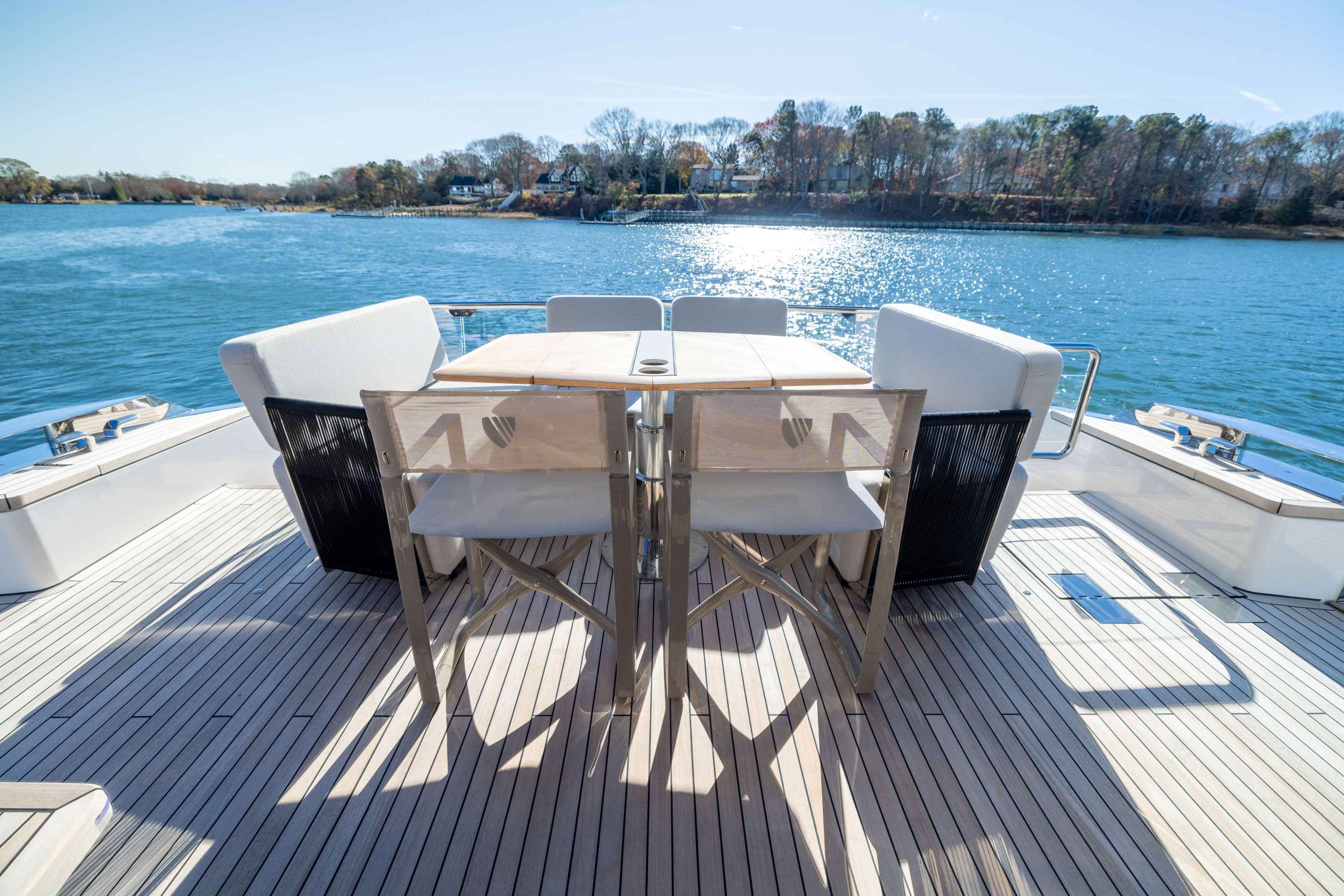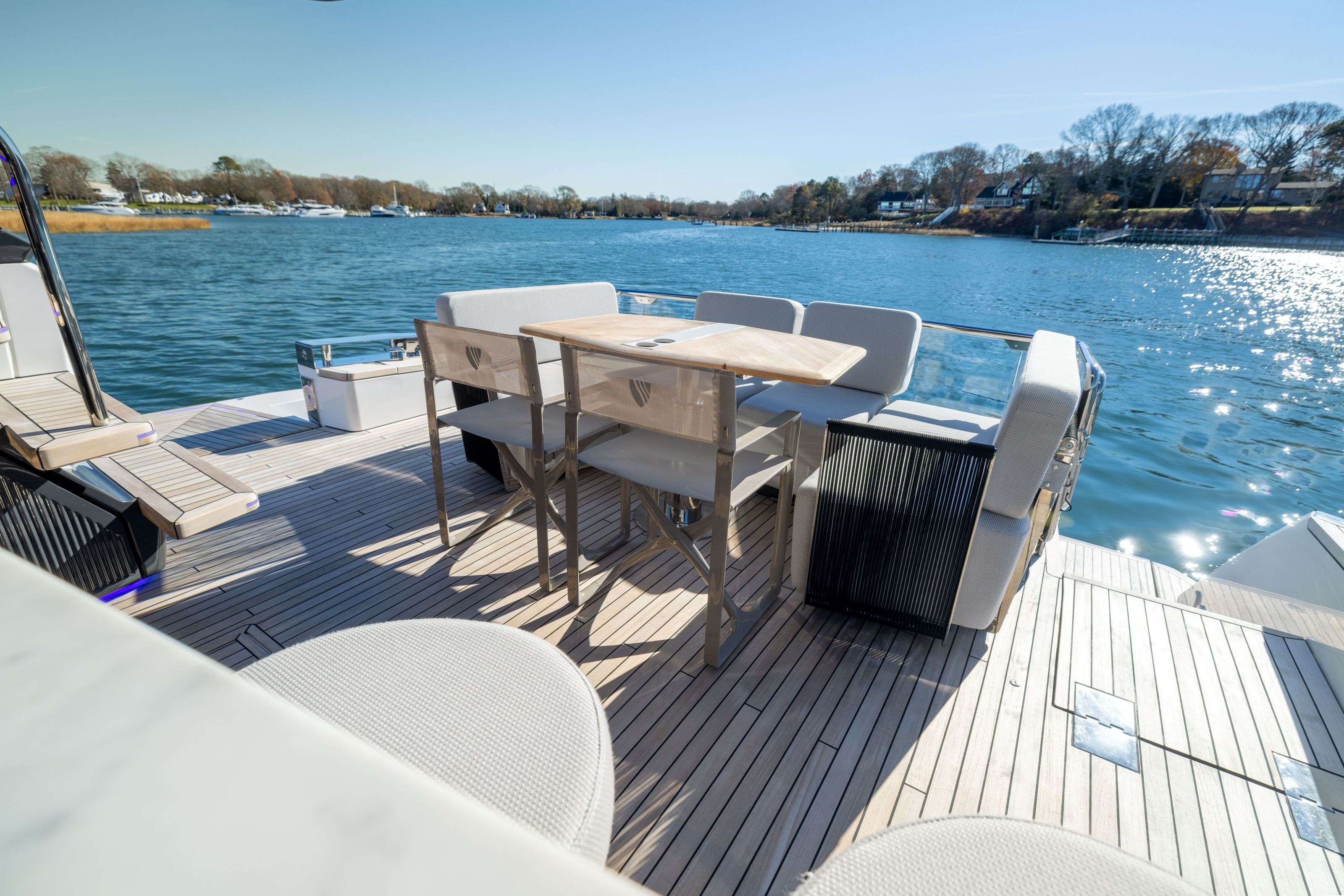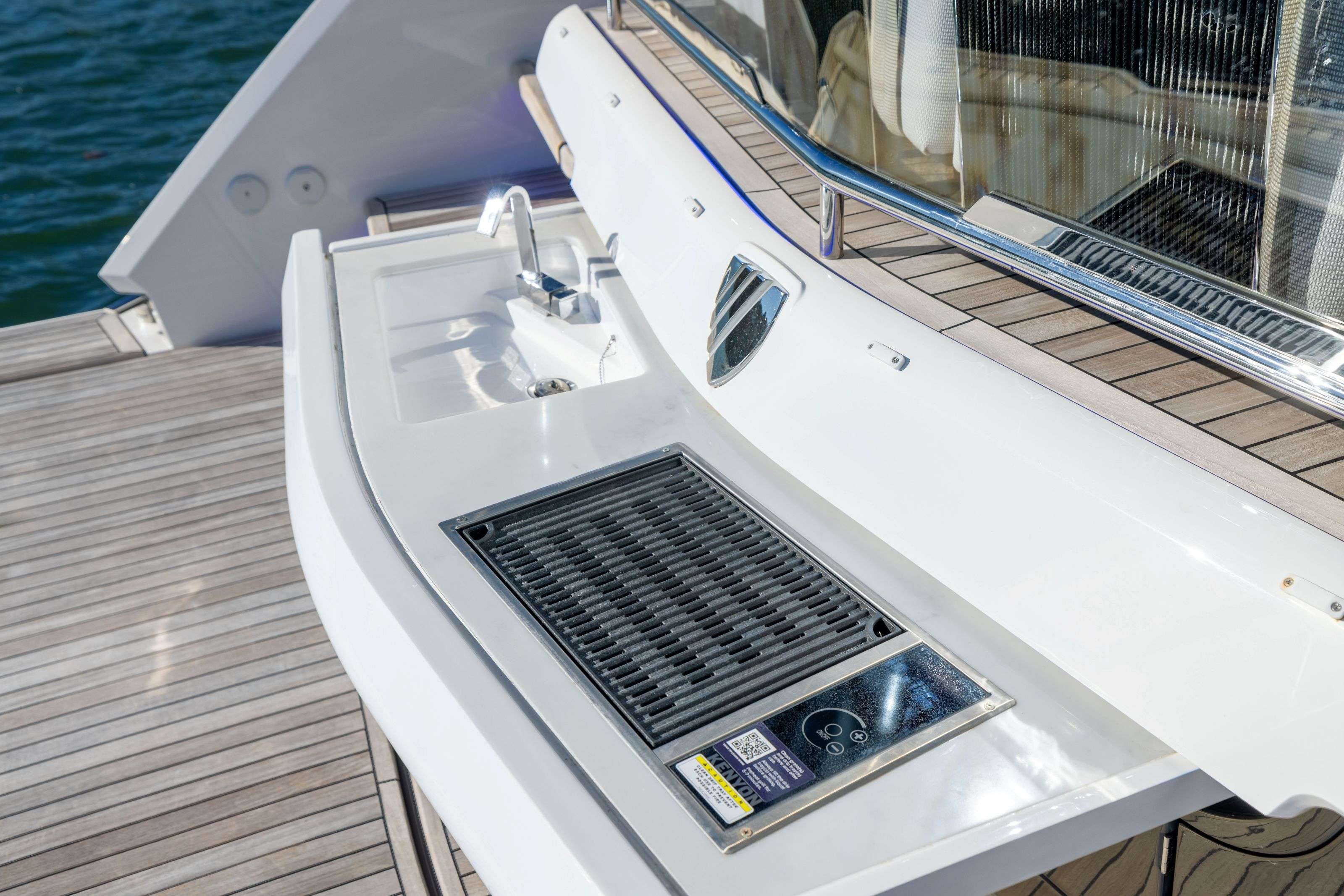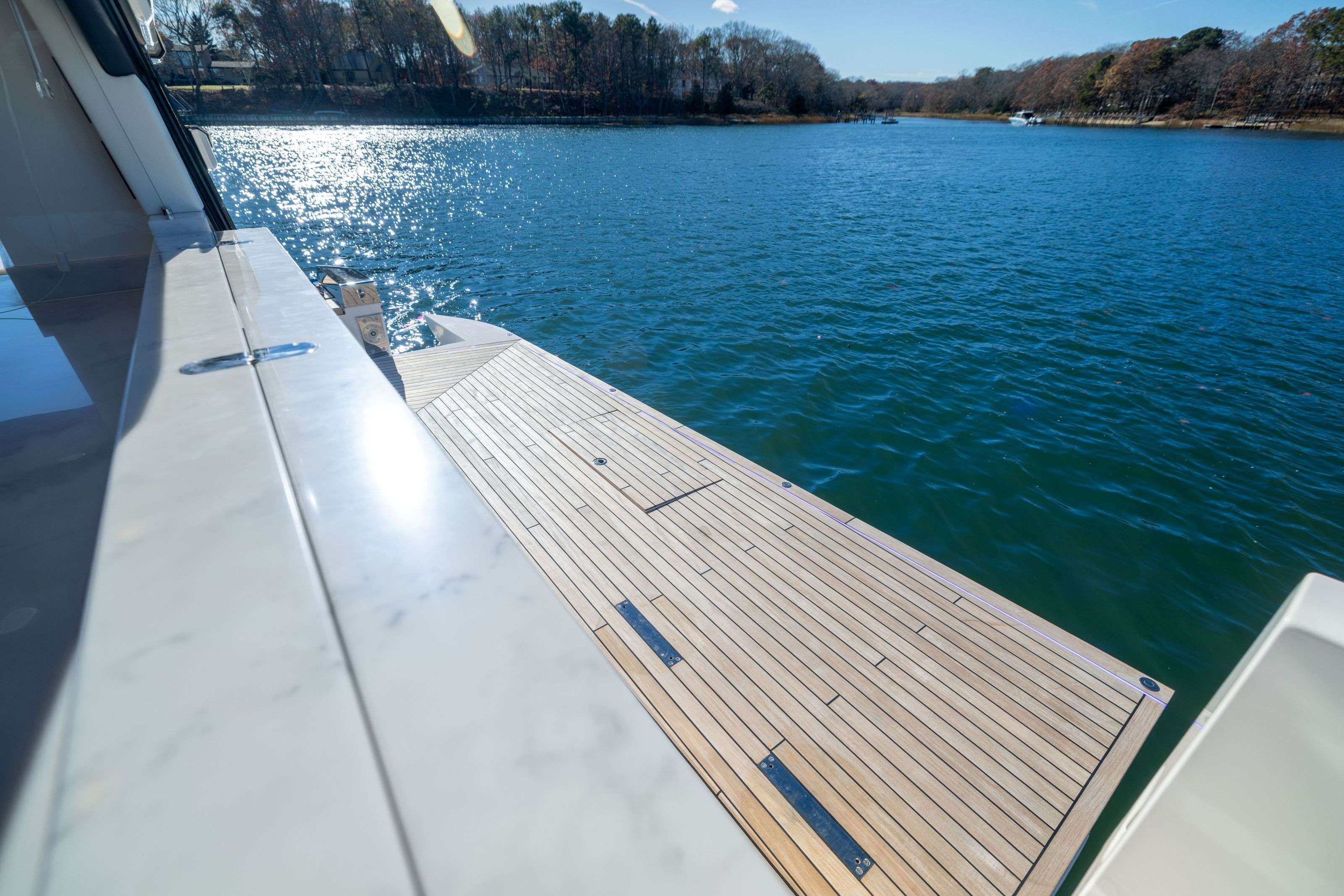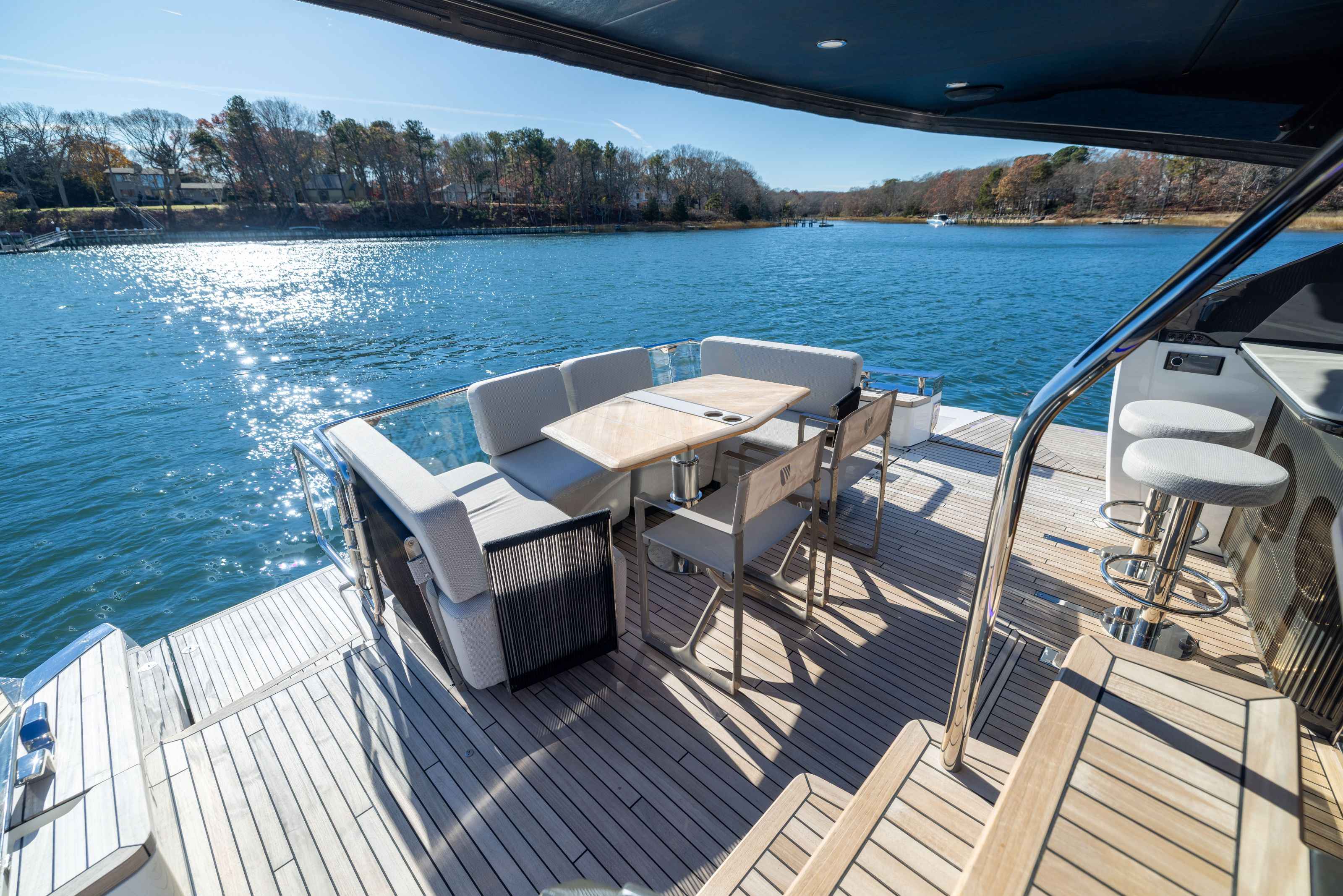 The expansive flybridge provides multiple seating and sunbathing options, all styled to integrate together to create that all important flow and balance while sheltering under the opening hardtop. The rakish exterior lines are both dynamic and elegant that preserve the timeless look of a Squadron, while the three fins adorn the panoramic saloon windows as its badge of distinction.