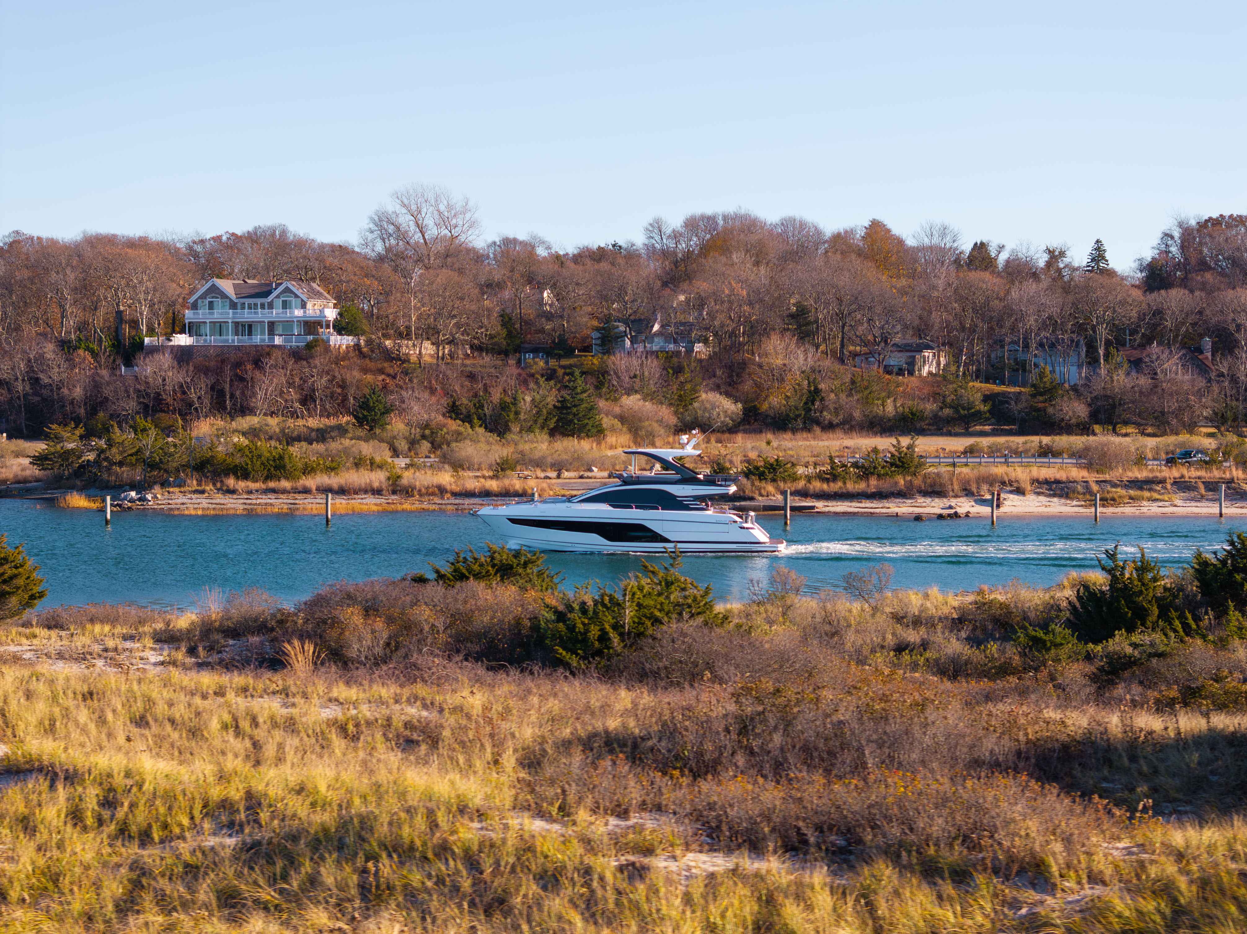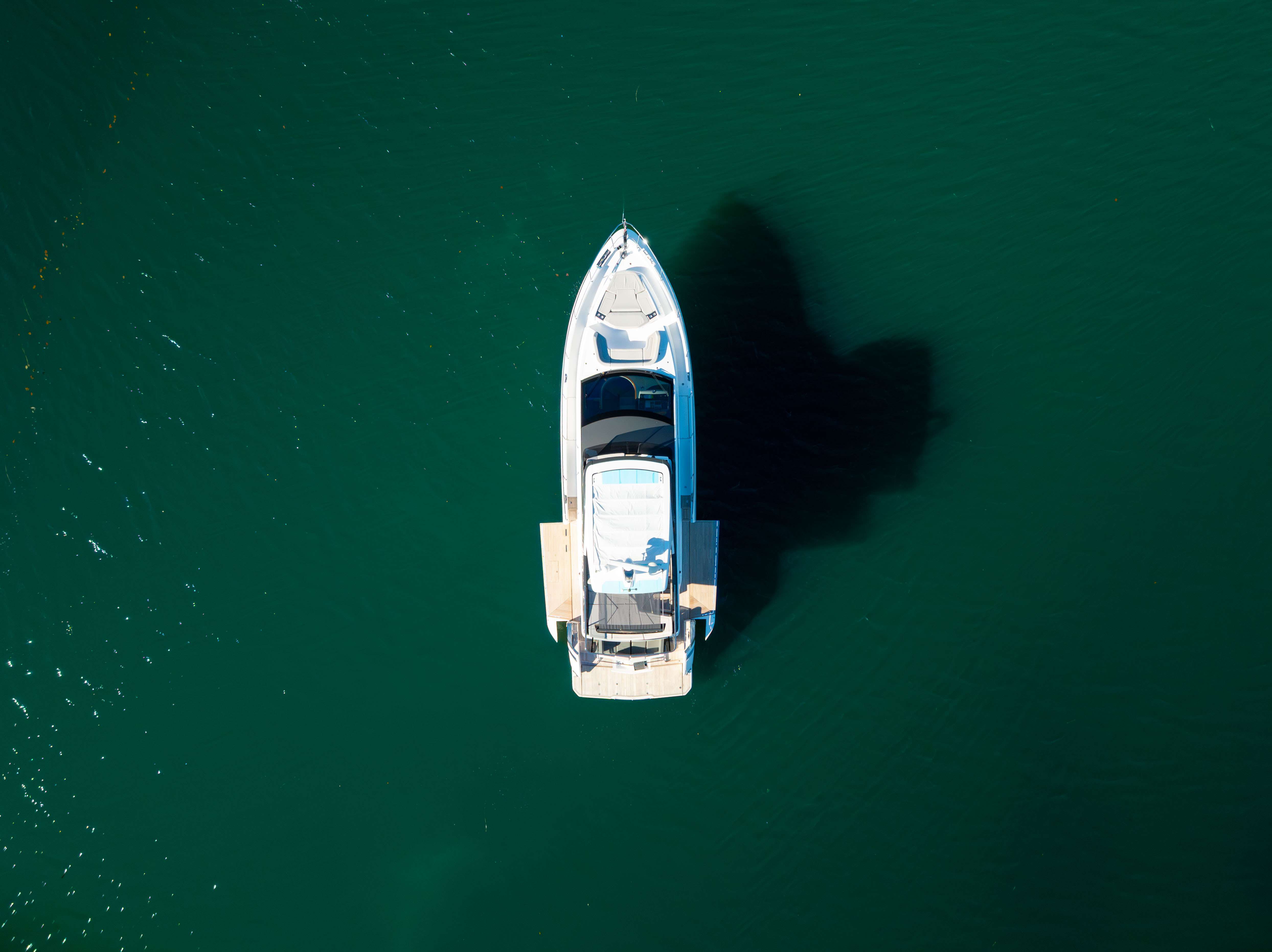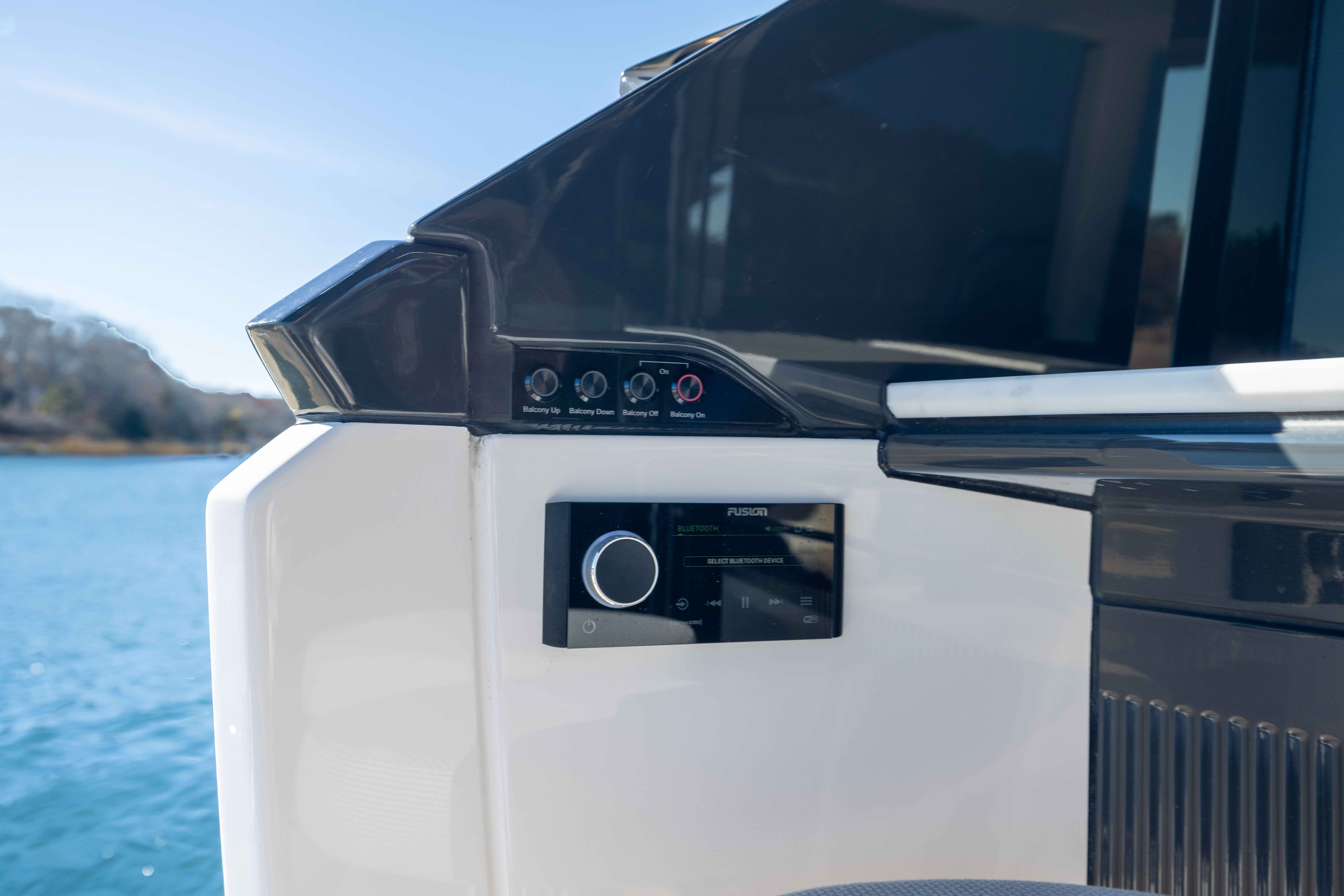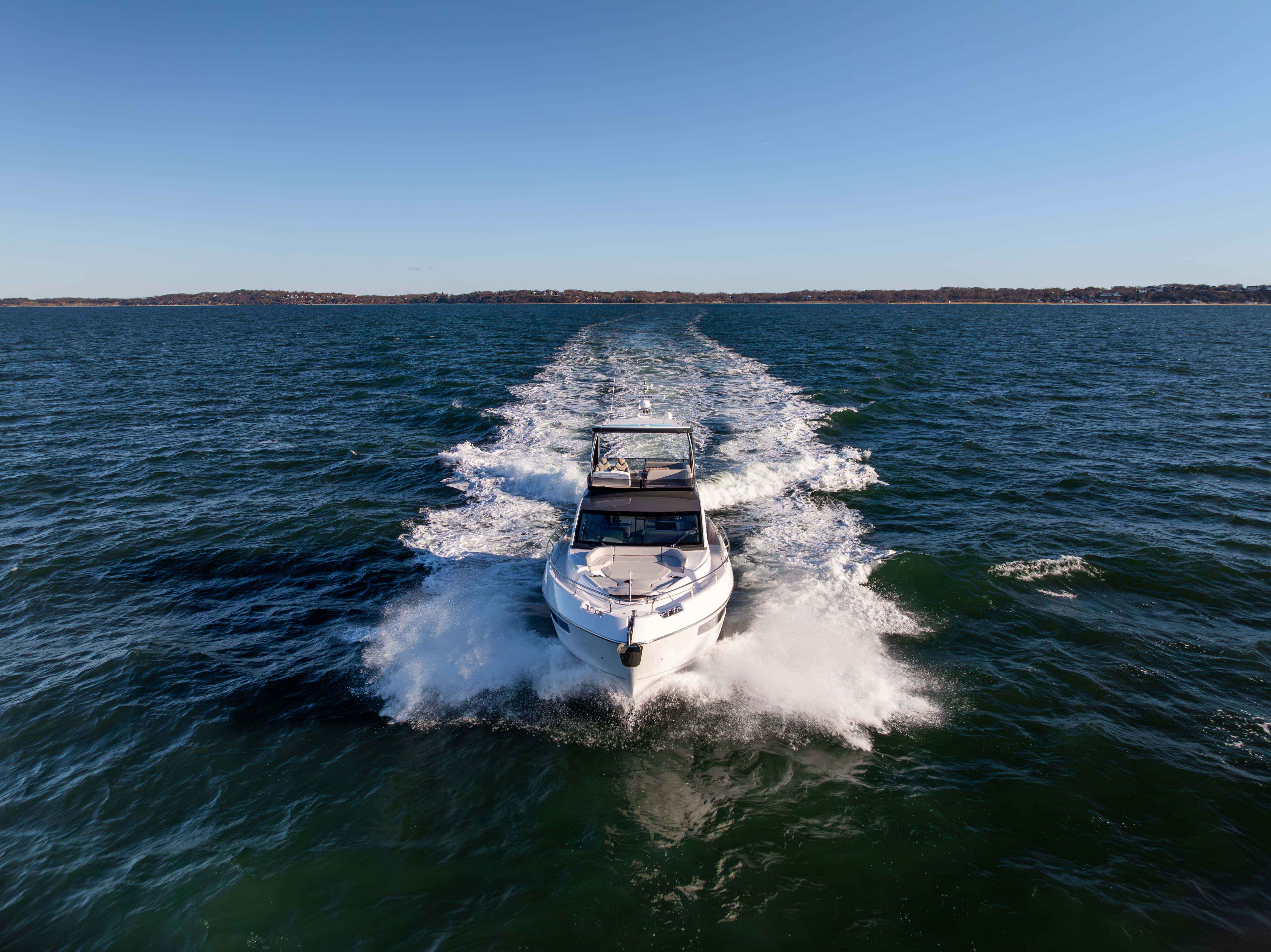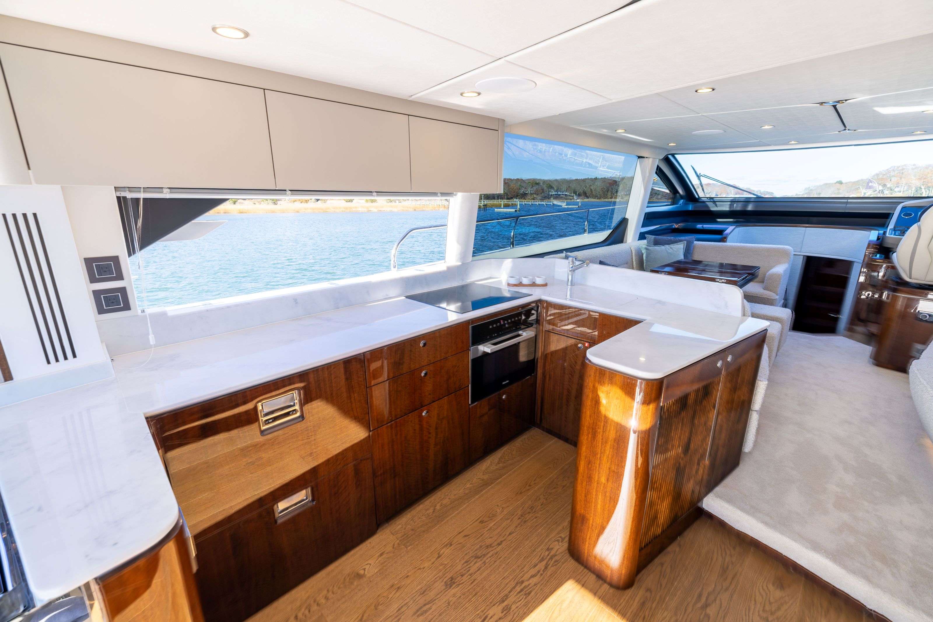 The expansive flybridge provides multiple seating and sunbathing options, all styled to integrate together to create that all important flow and balance while sheltering under the opening hardtop. The rakish exterior lines are both dynamic and elegant that preserve the timeless look of a Squadron, while the three fins adorn the panoramic saloon windows as its badge of distinction.