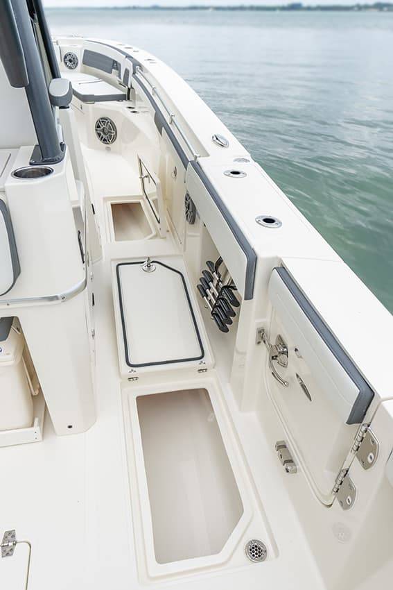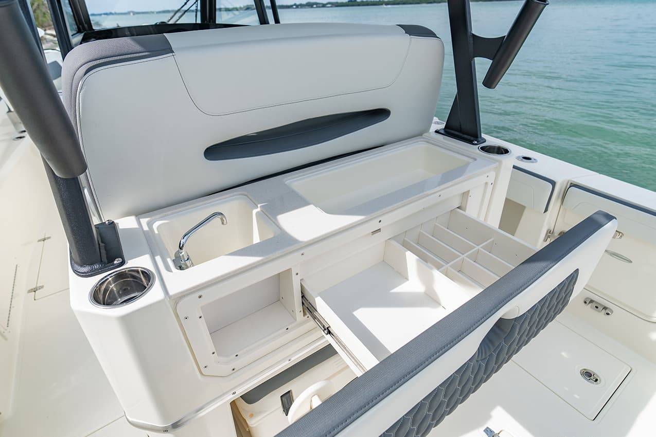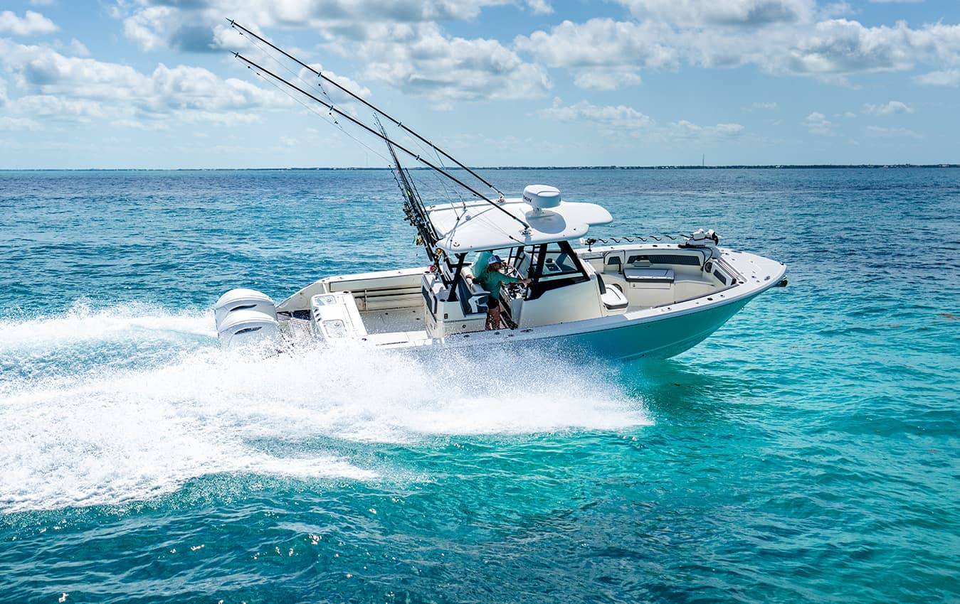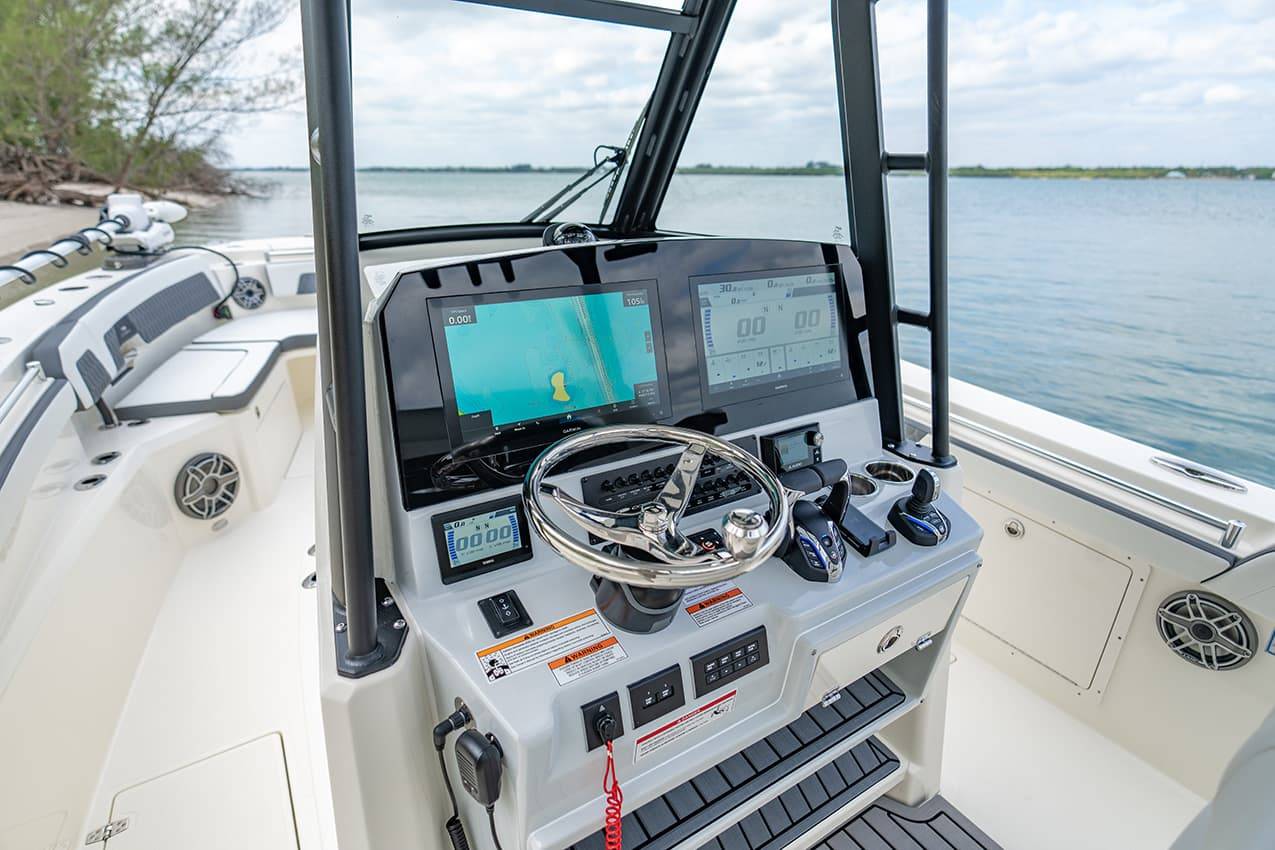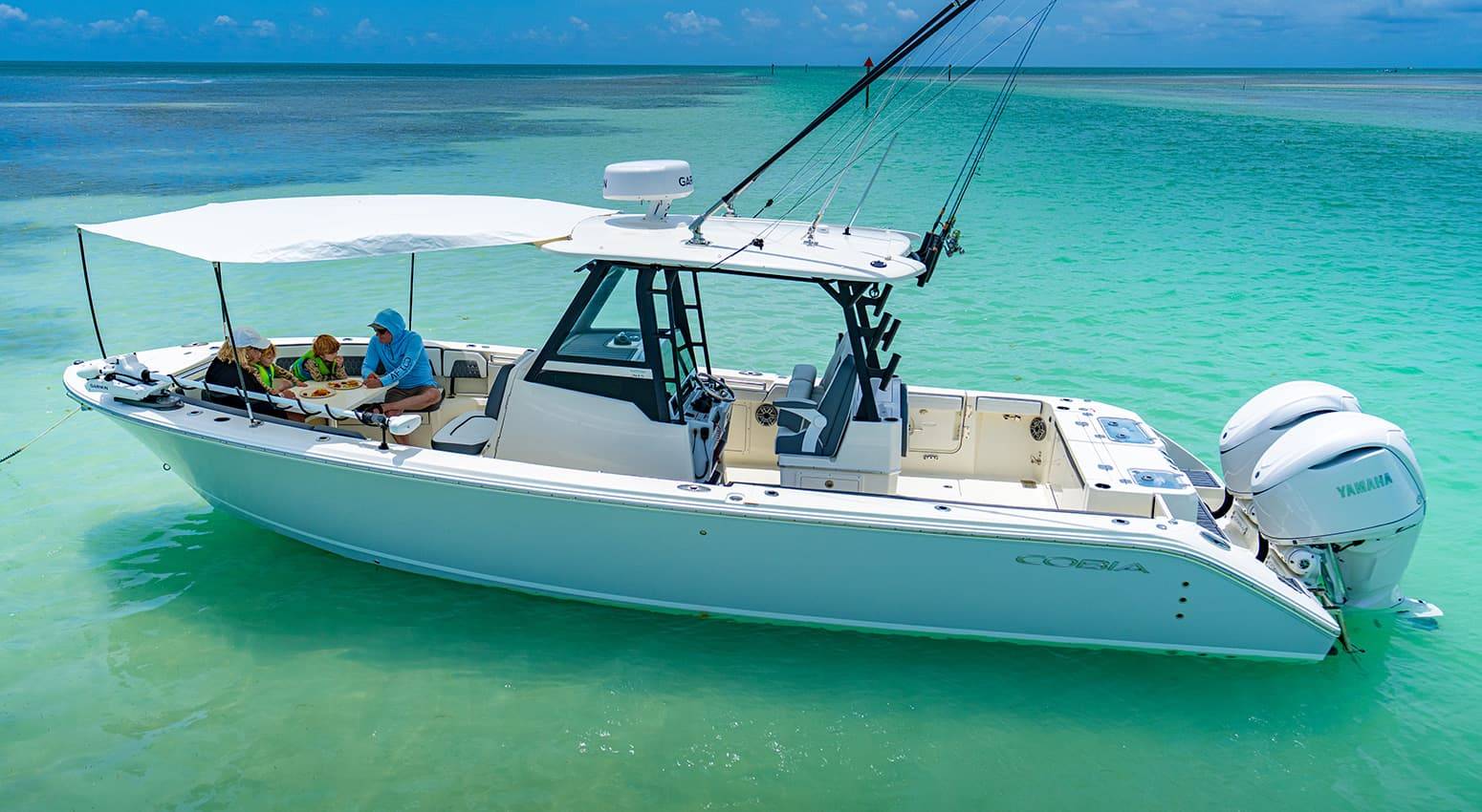 The Cobia 305 CC delivers an exceptionally smooth, dry ride and the optional Seakeeper Ride system, which auto-adjusts for ideal running angles and stability when underway, only adds to performance. Anglers will appreciate four strategically placed, insulated fishboxes and dual stern livewells alongside optional upgrades like the Garmin Force Kraken trolling motor and deep-drop package. With ample convertible seating, a spacious bow with adjustable table, easy-access head, and 265 gallons of usable fuel capacity, the 305 CC blends 30-foot center console fishing power with comfort your whole family will appreciate.
