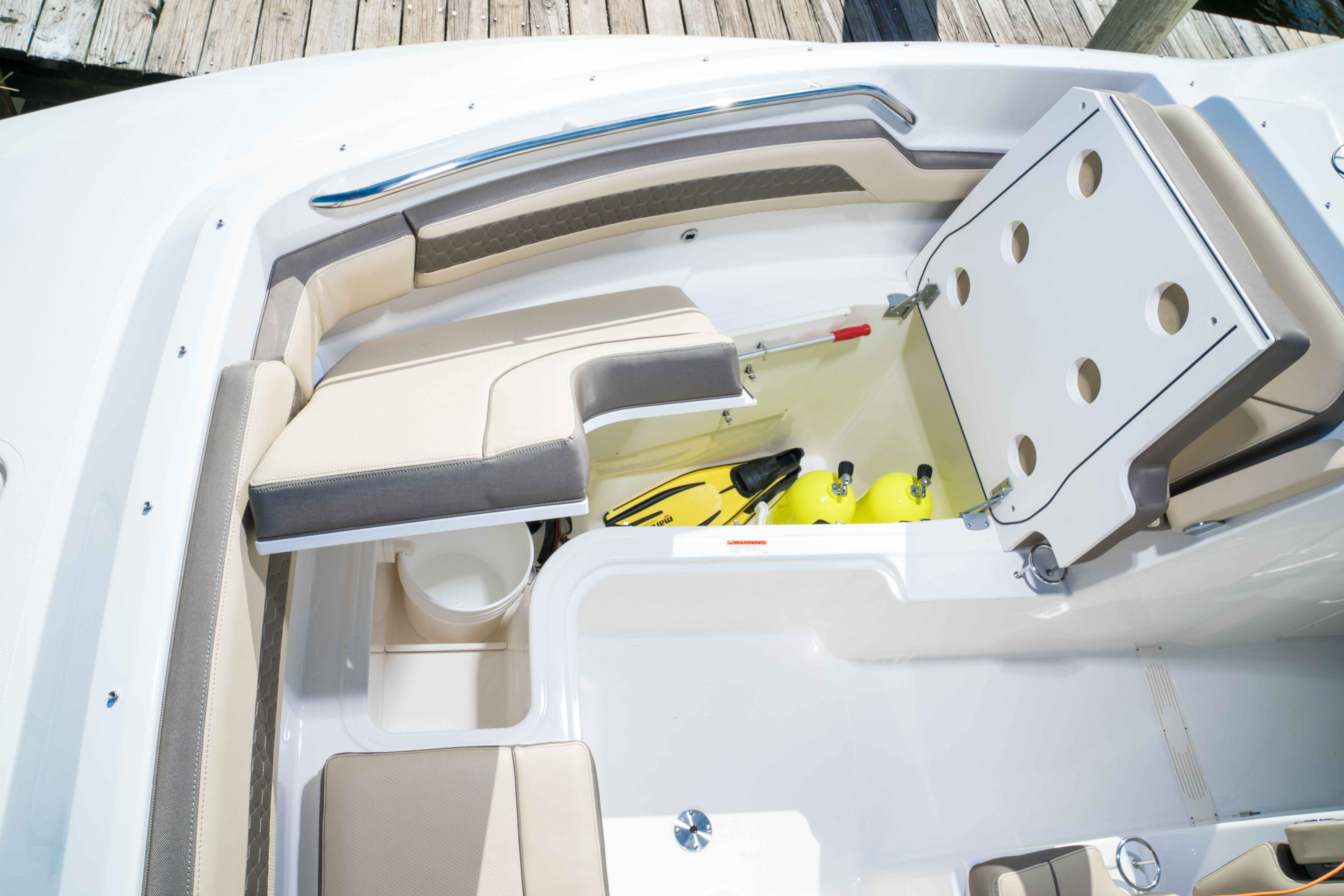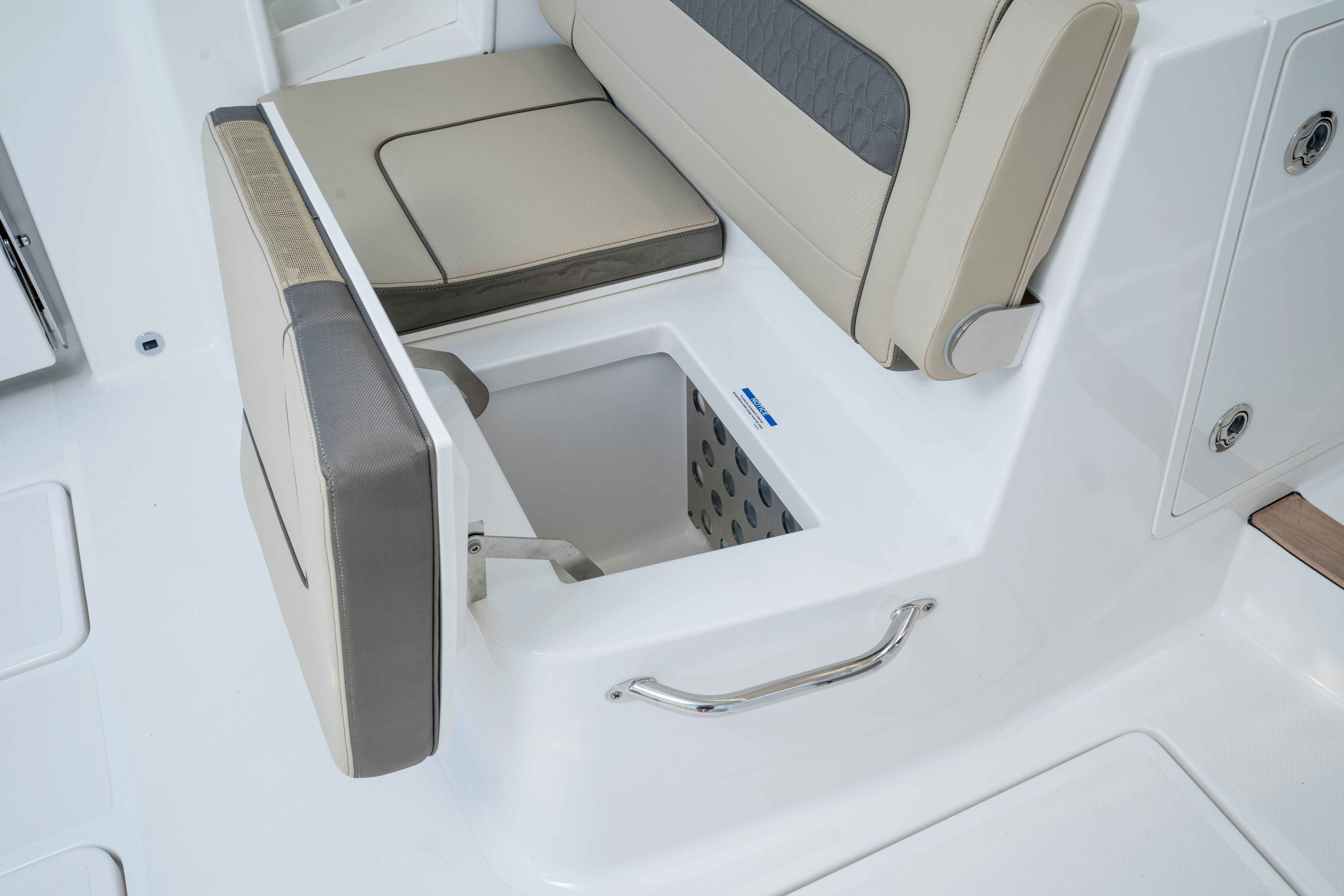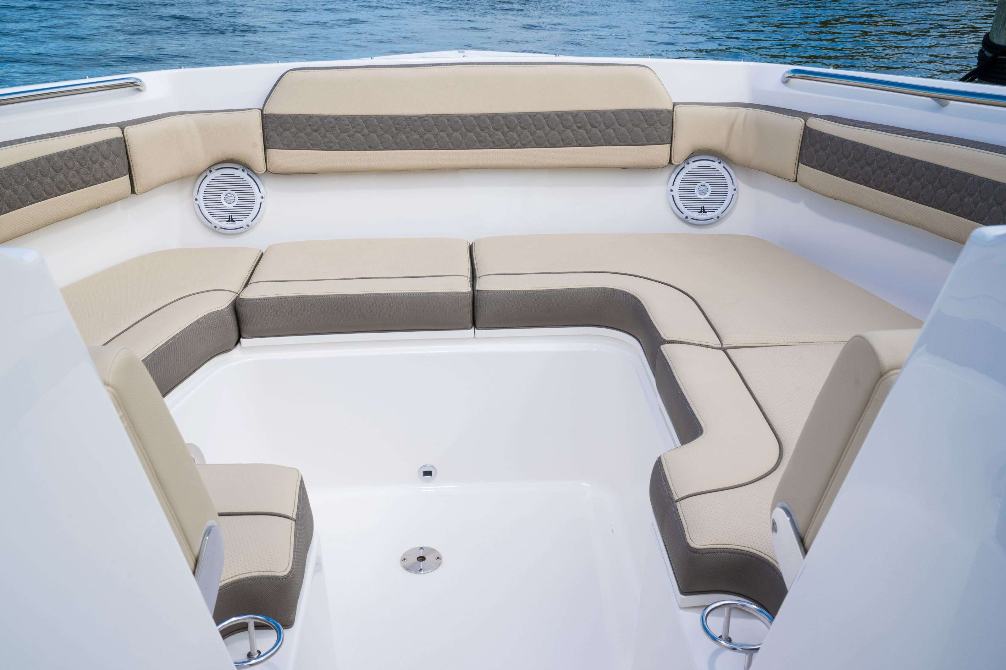 Forward bow and port side lounge seating, a swivel seat at the helm and patent-pending fold away seating at the transom and under the gunwale give your crew a comfortable place to enjoy whatever type of water activities you choose.