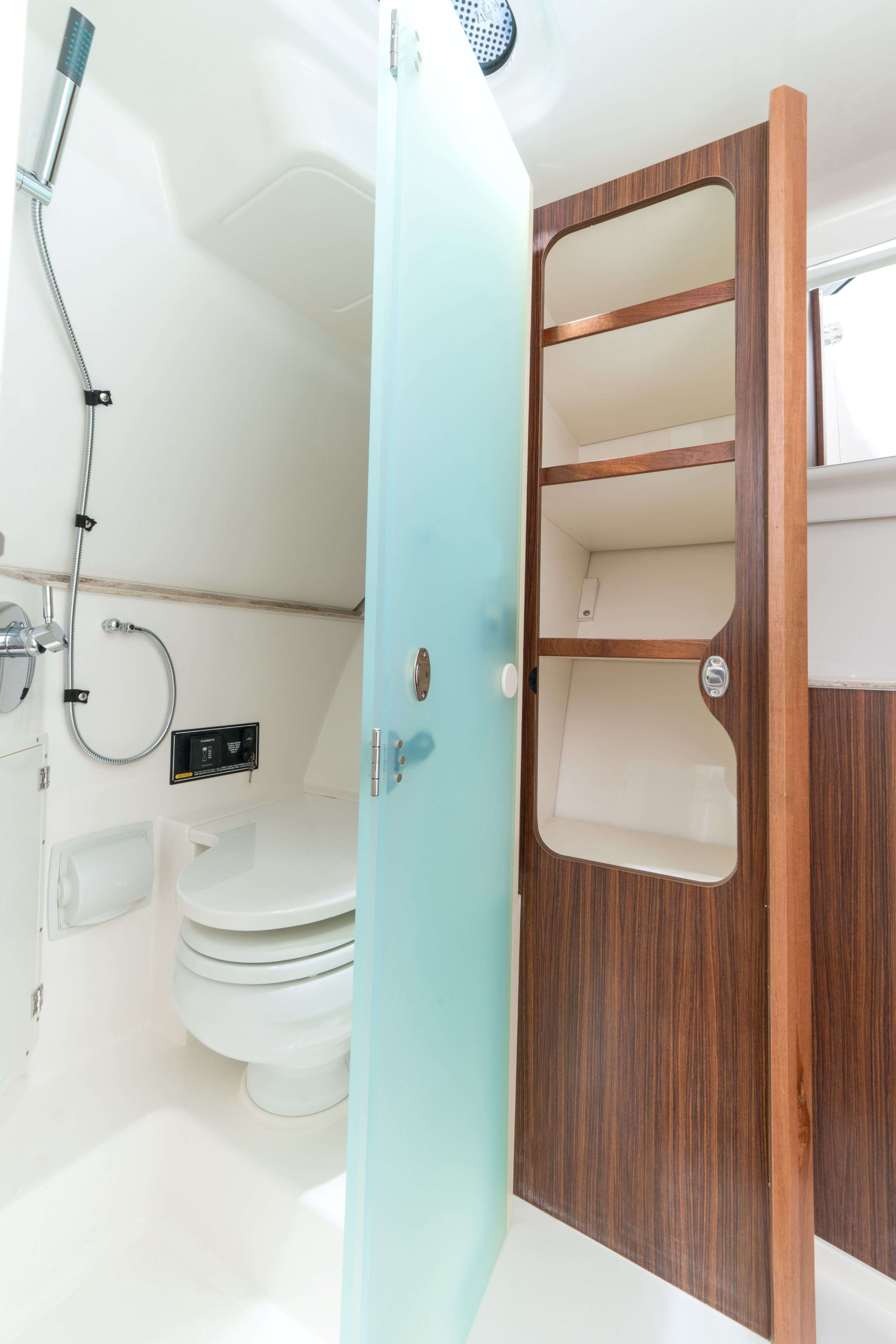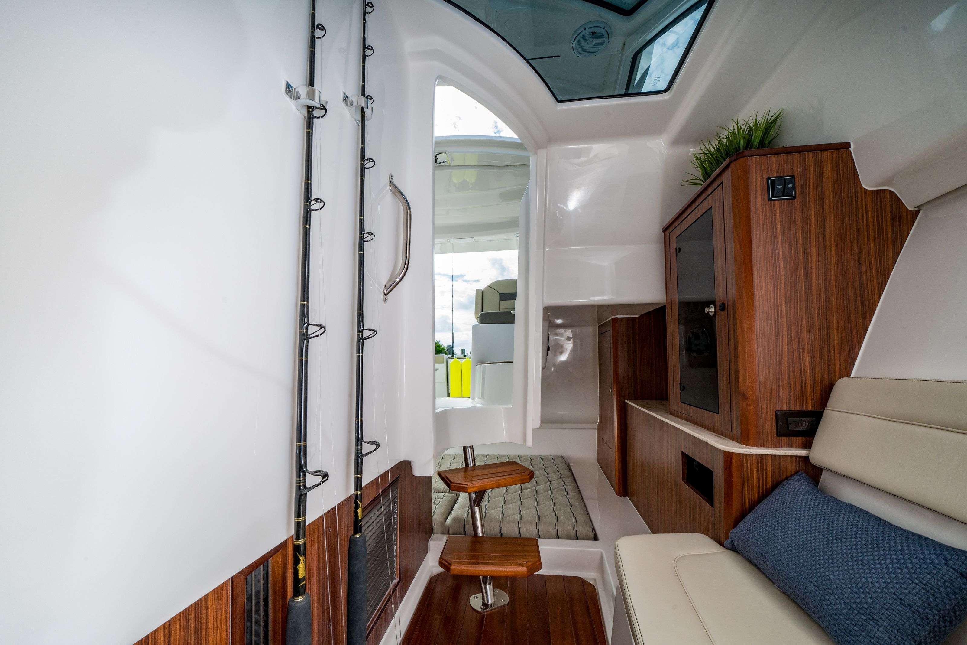 The cabin is easily accessible with a fiberglass door and features solid wood accents with modern finishes, a full berth forward and a comfortable aft berth. A small family or couple may overnight with basic amenities for the weekend. Hull side windows reveal plenty of natural light below.