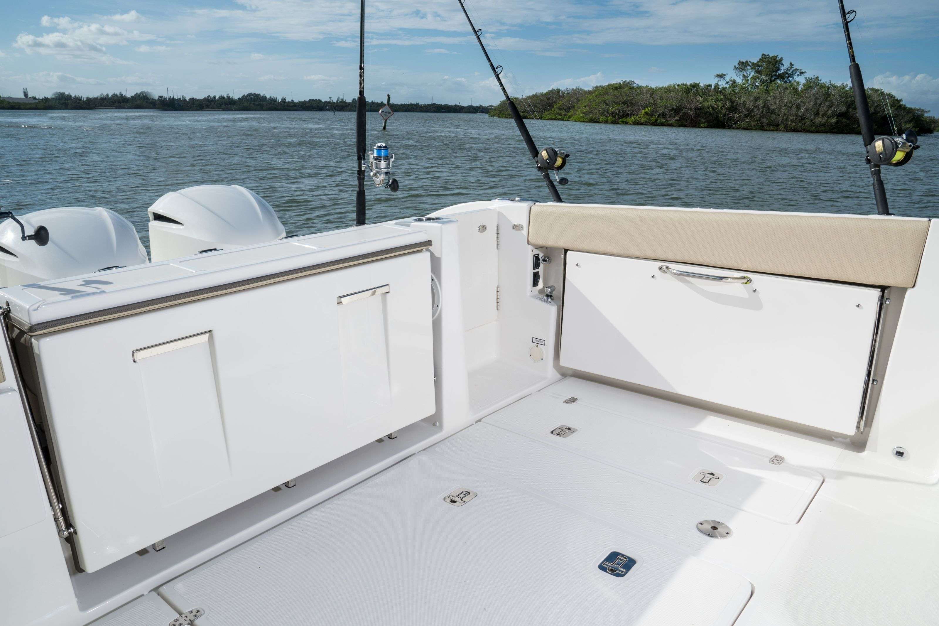 Foldaway seating quickly transforms a social venue to a wide-open, fish-ready cockpit with hull side door, livewell, gunwale mounted rod holders and insulated fish-boxes in the floor.