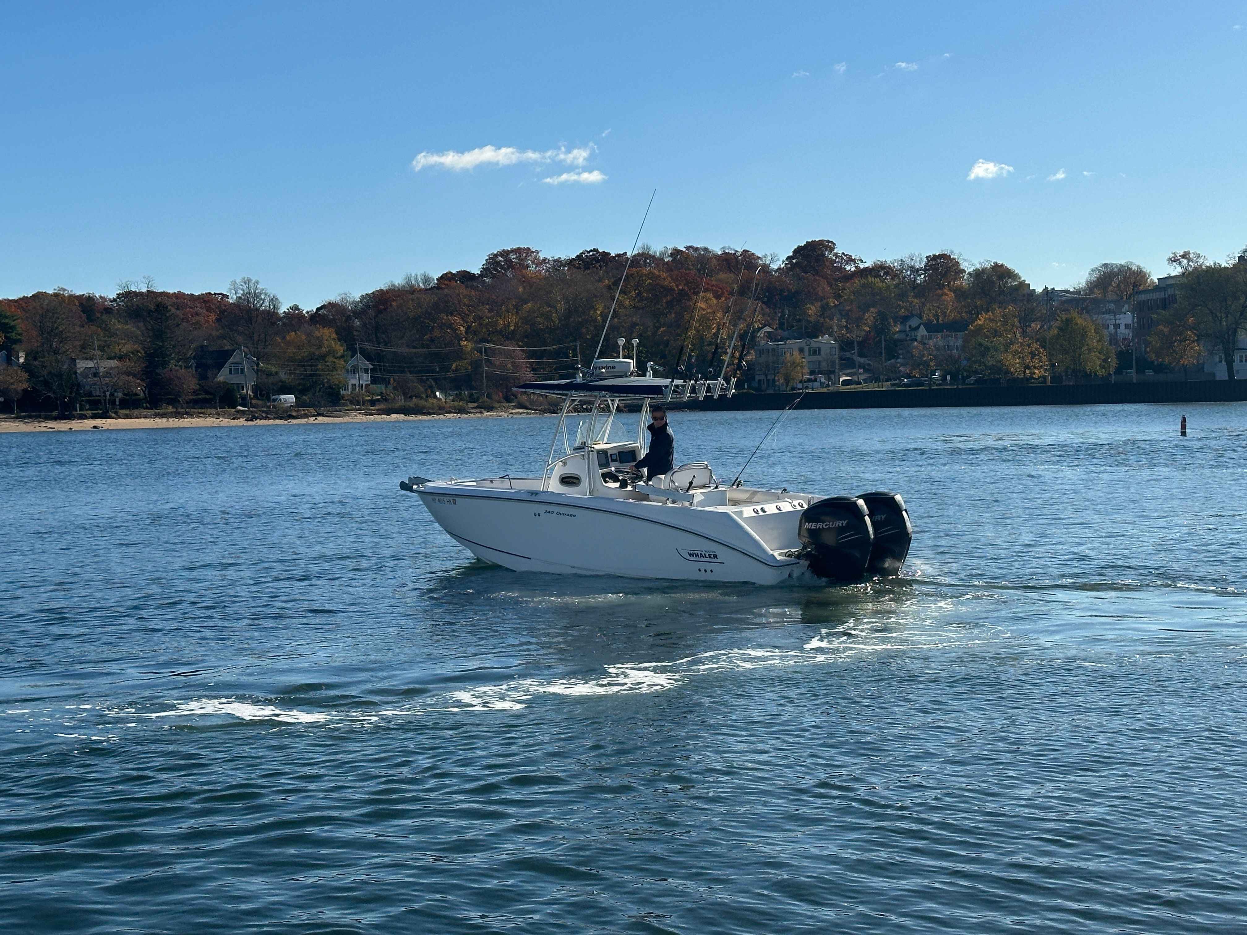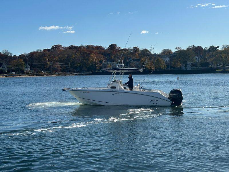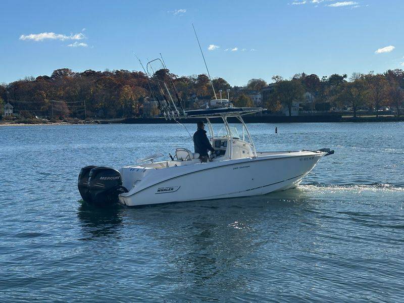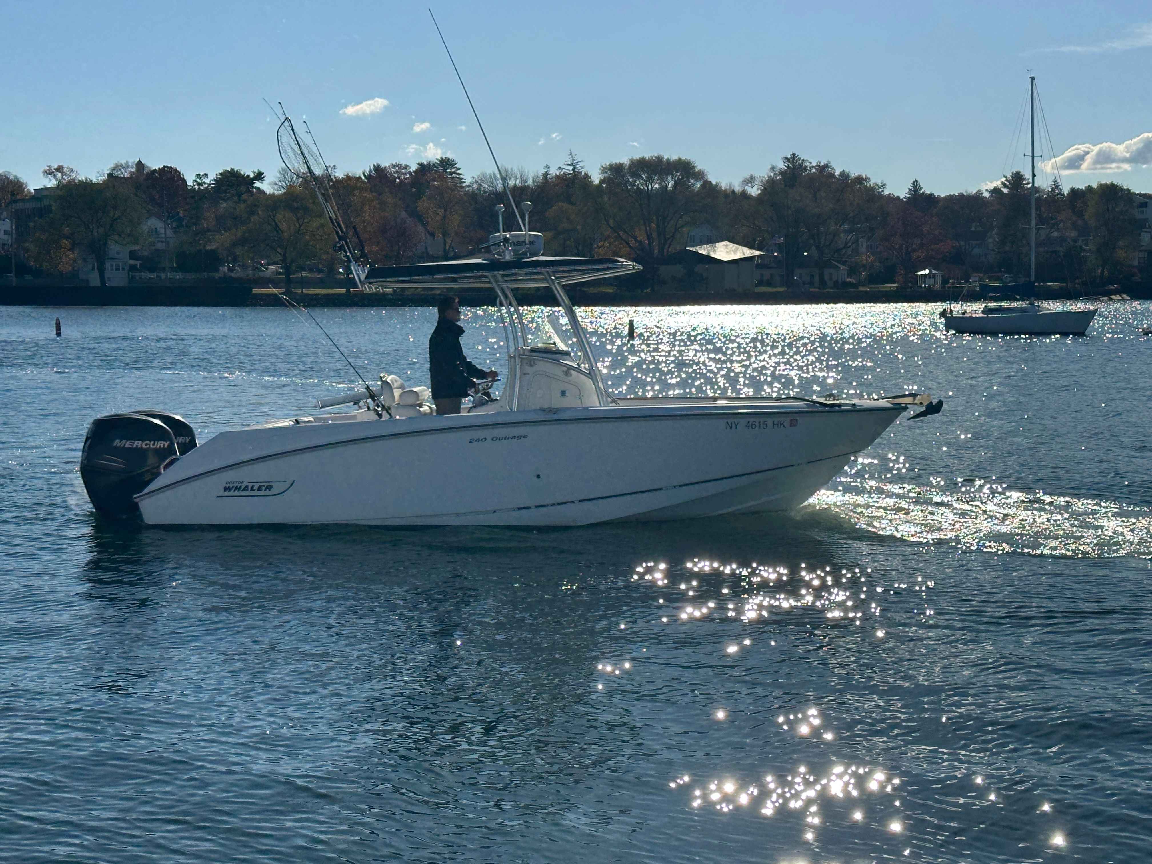 Introducing the 2006 Boston Whaler 240 Outrage powered by Twin Mercury Verado 150 hp four‑stroke outboards. This boat combines Whaler’s legendary “unsinkable” build quality and excellent ride characteristics with modern, fuel-efficient power. Ideal for fishing, day cruising, or offshore runs, it delivers both performance and comfort.