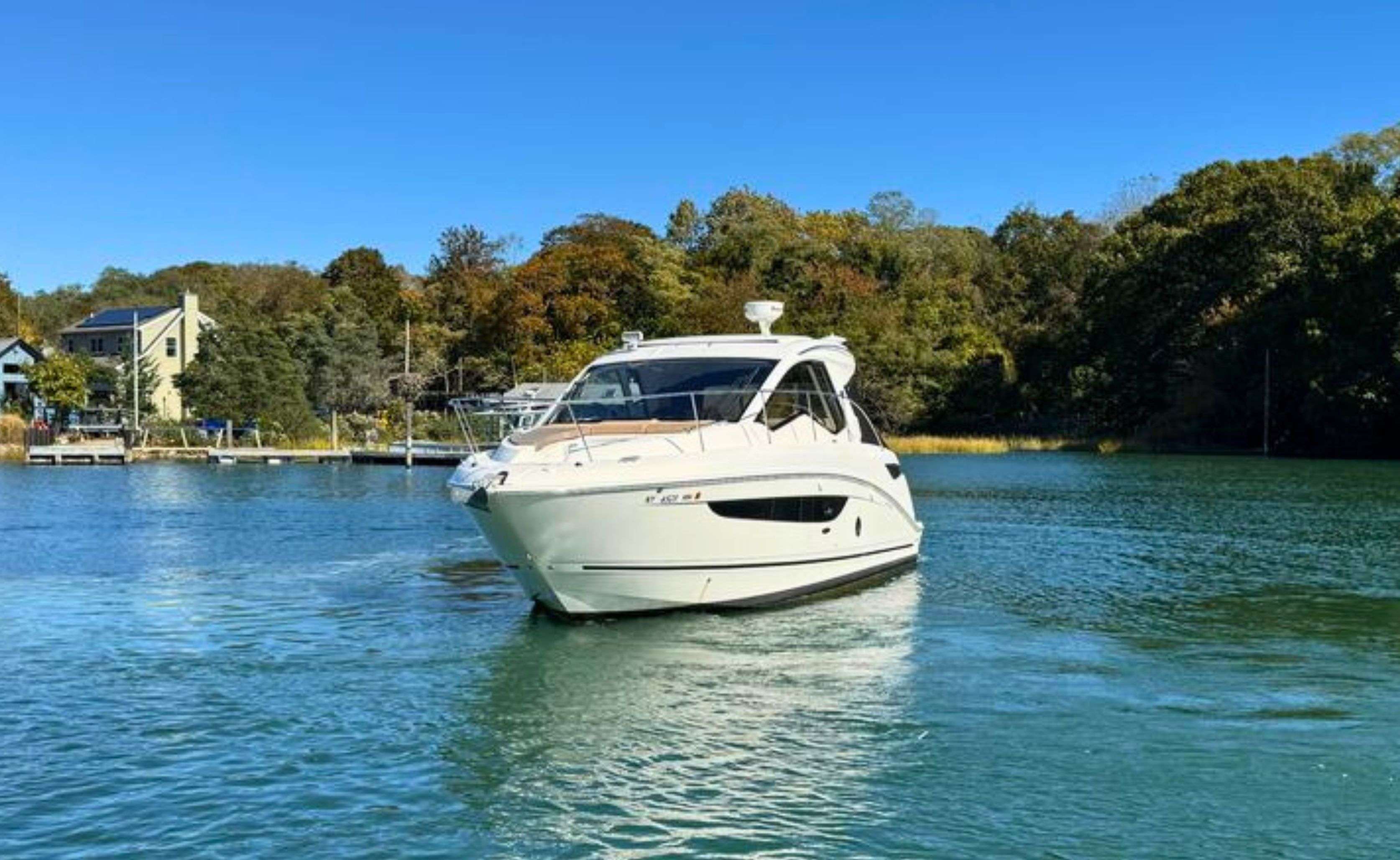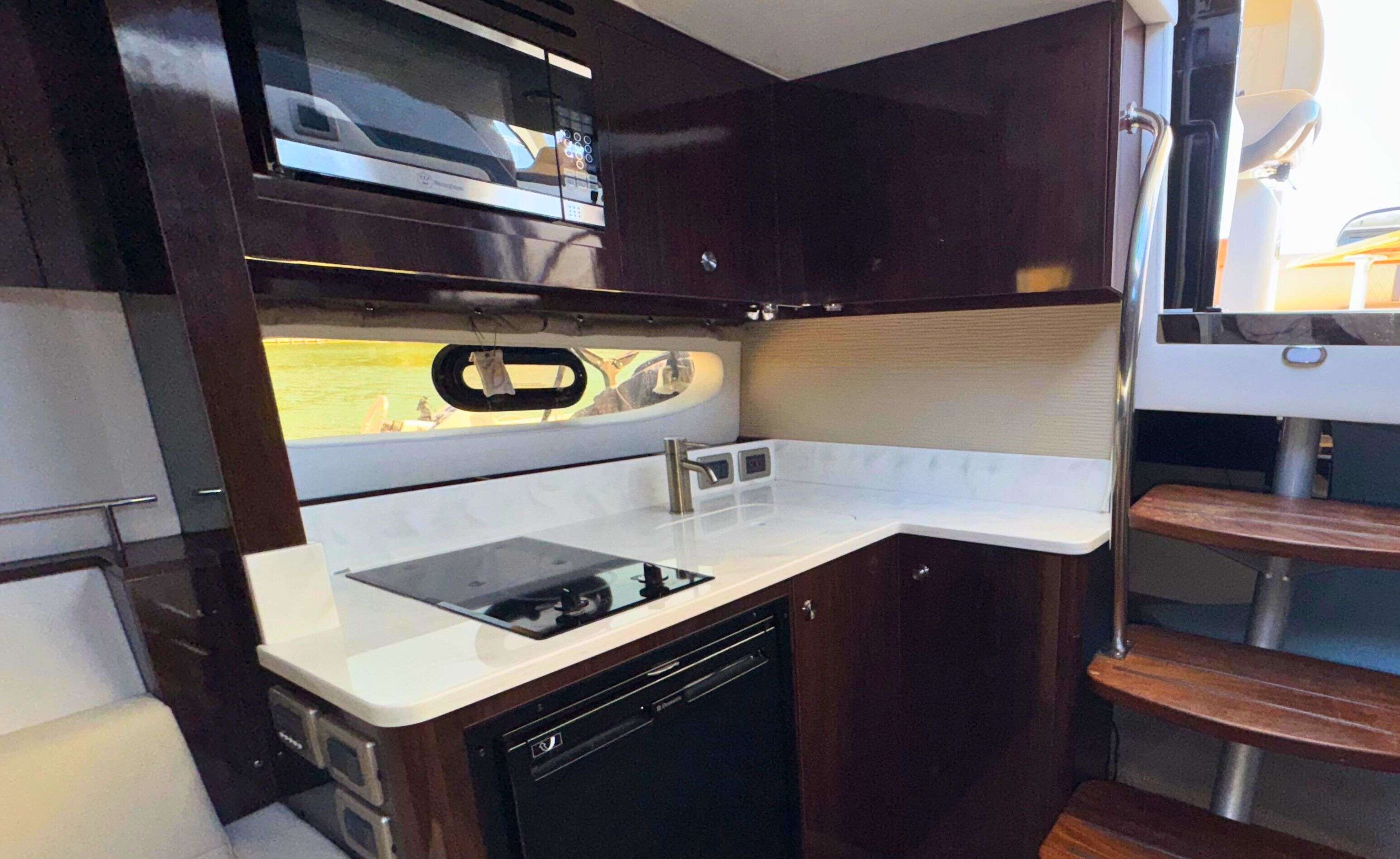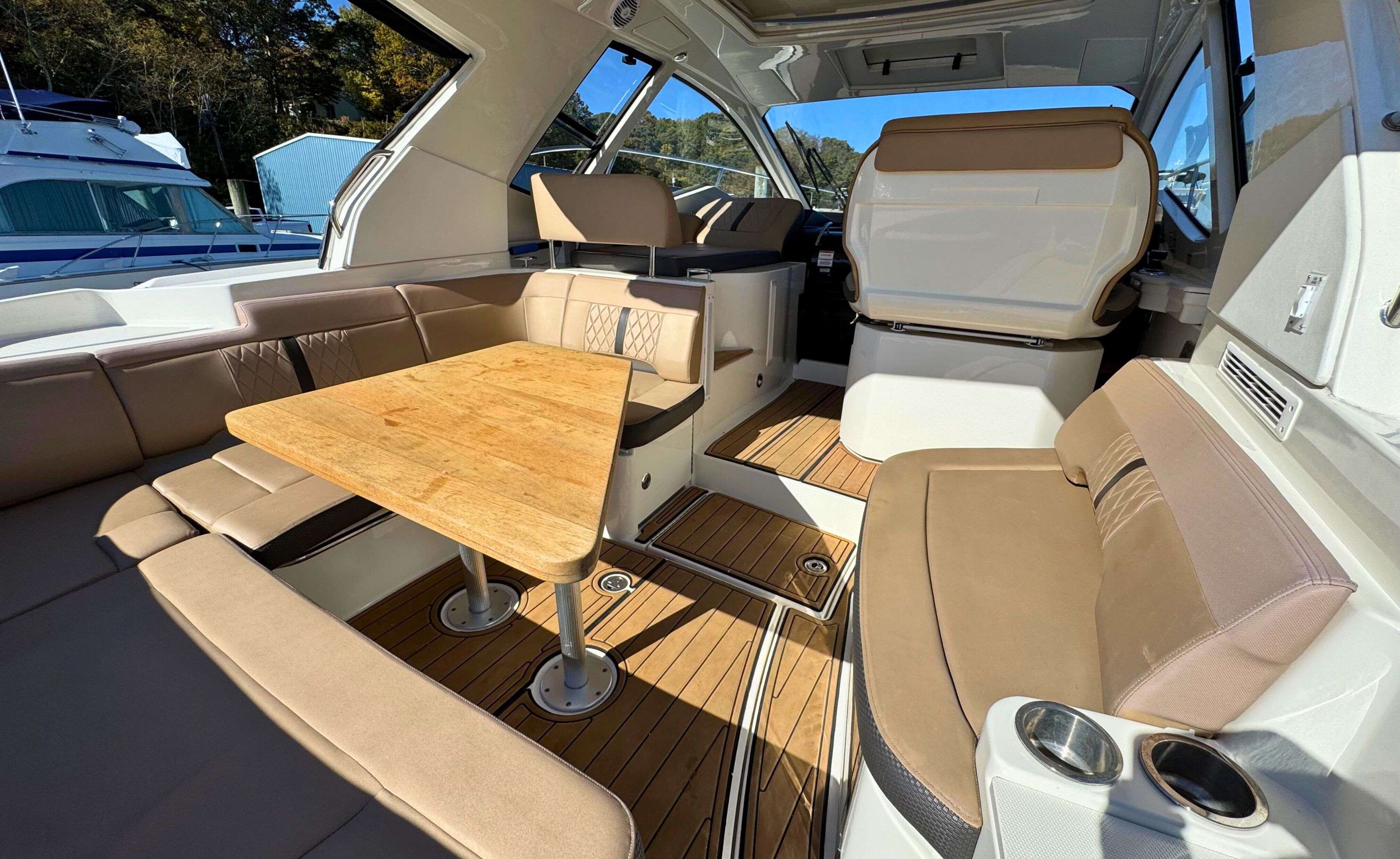 Below deck, the Sundancer 350 impresses with an open-plan cabin layout, warm wood flooring, and upscale finishes throughout.