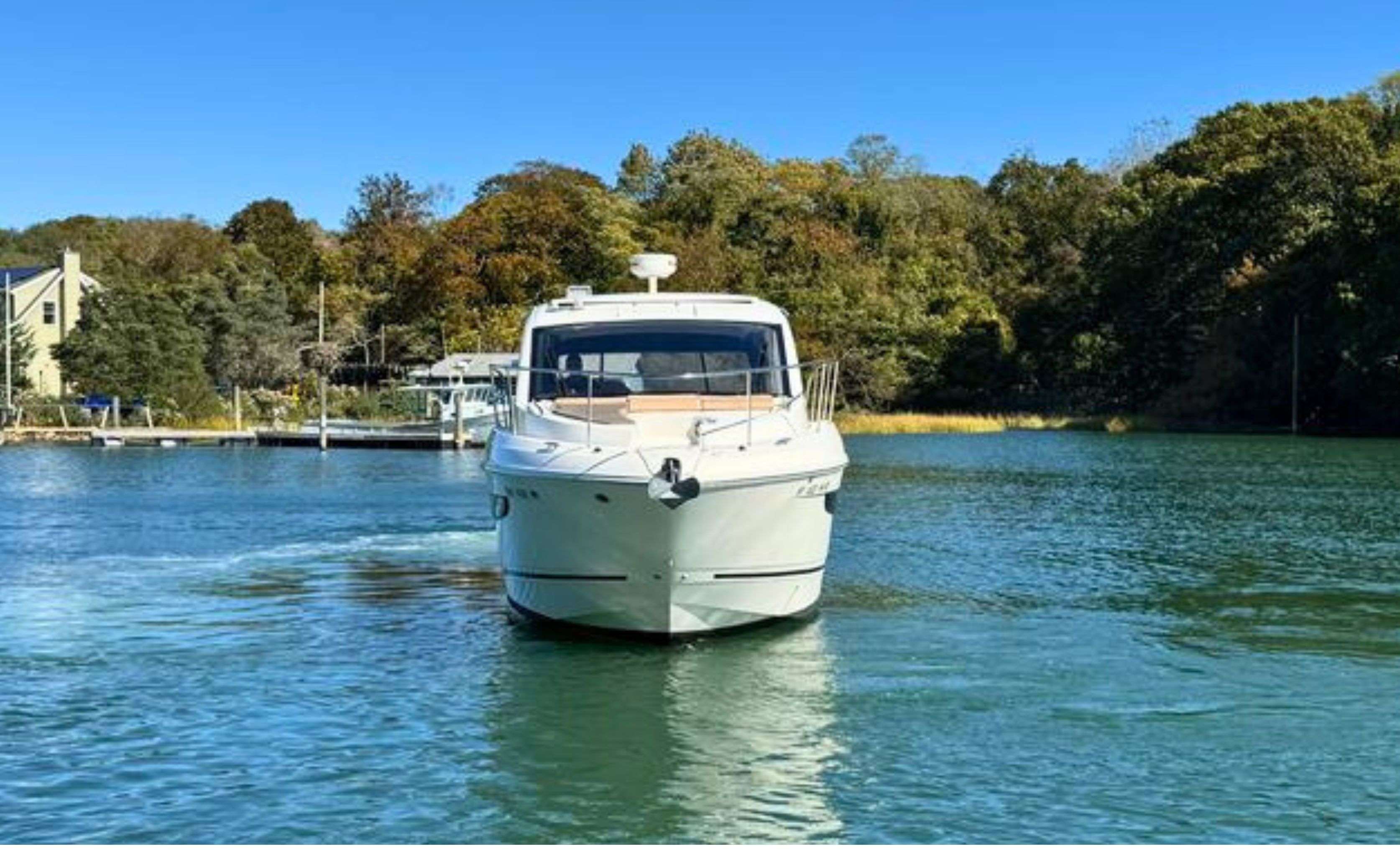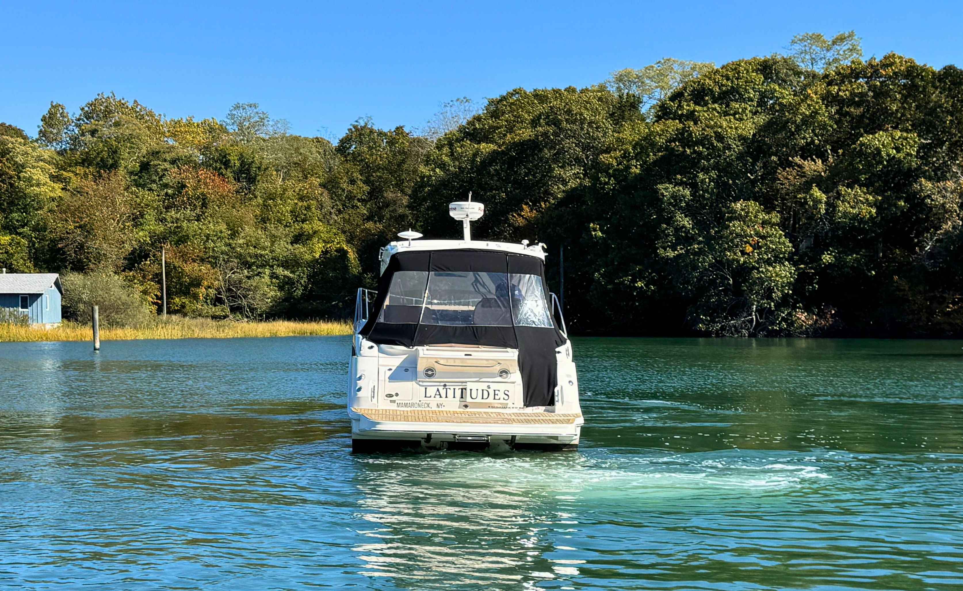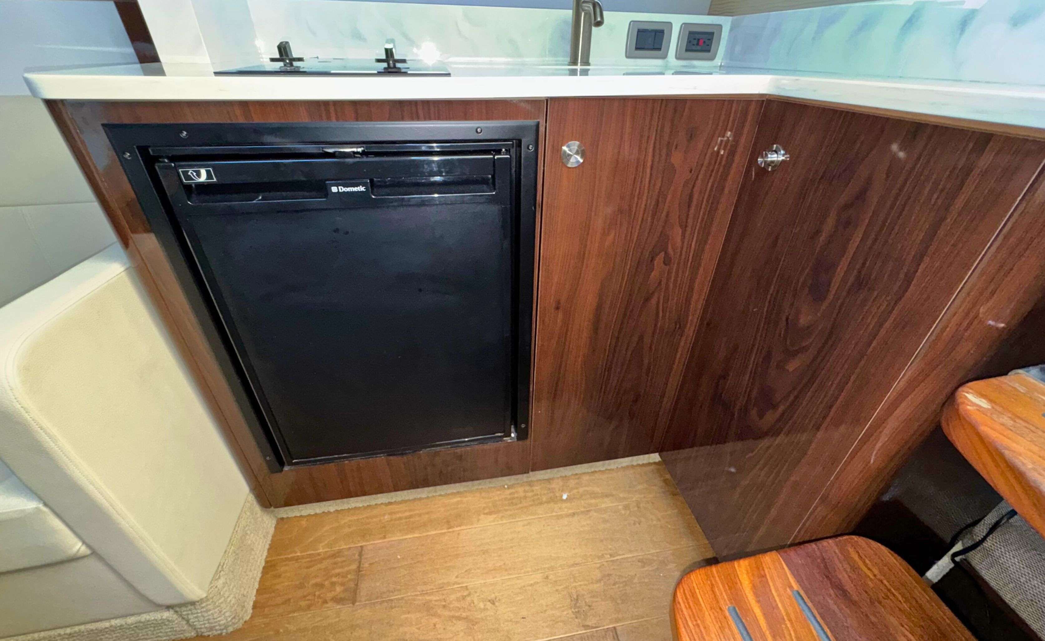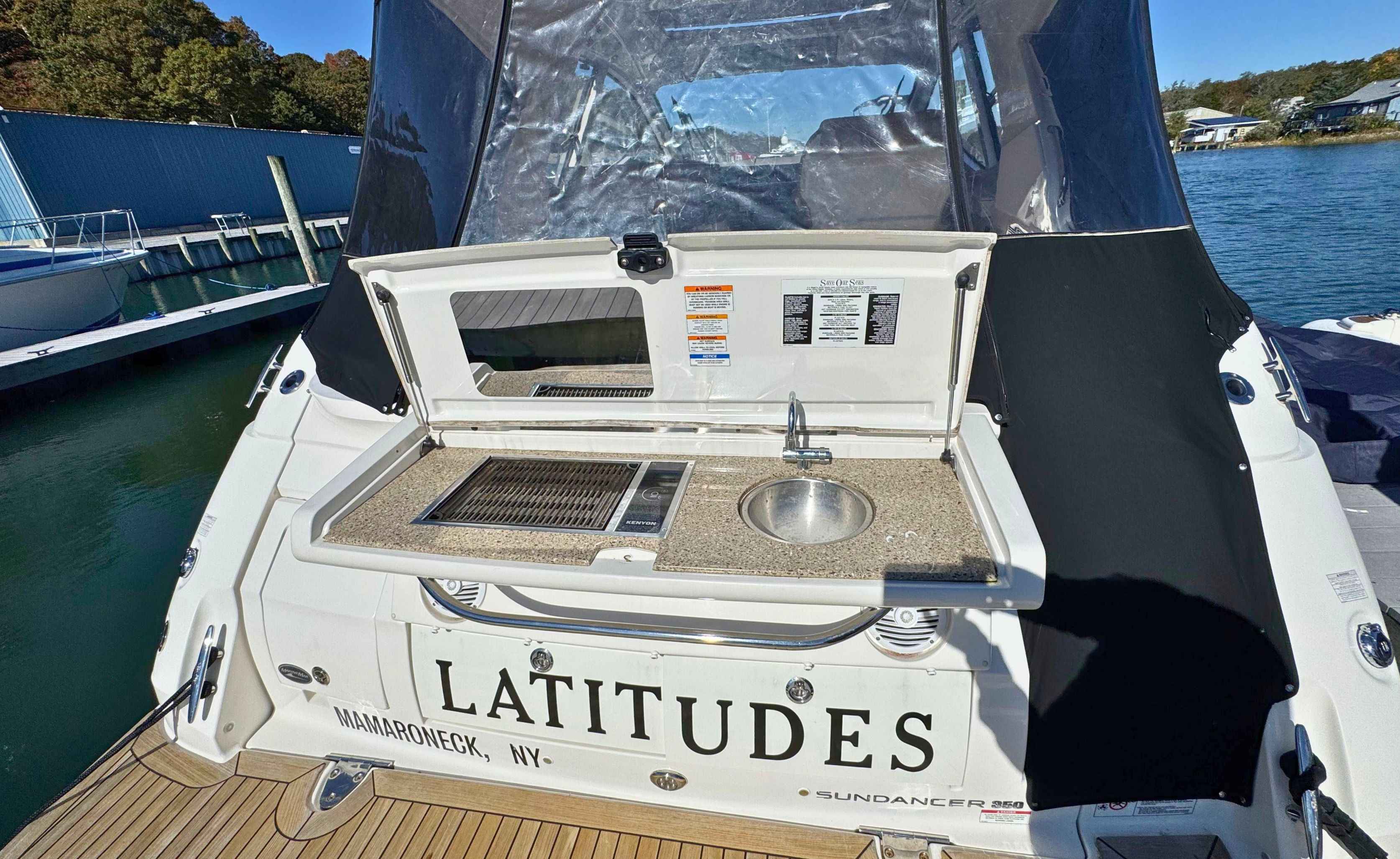 Below deck, the Sundancer 350 impresses with an open-plan cabin layout, warm wood flooring, and upscale finishes throughout.