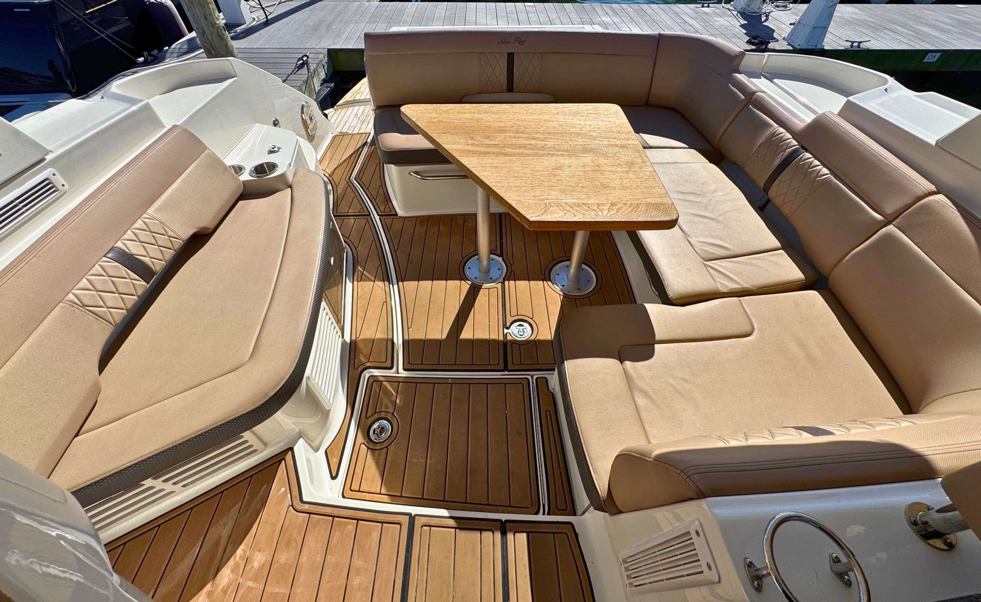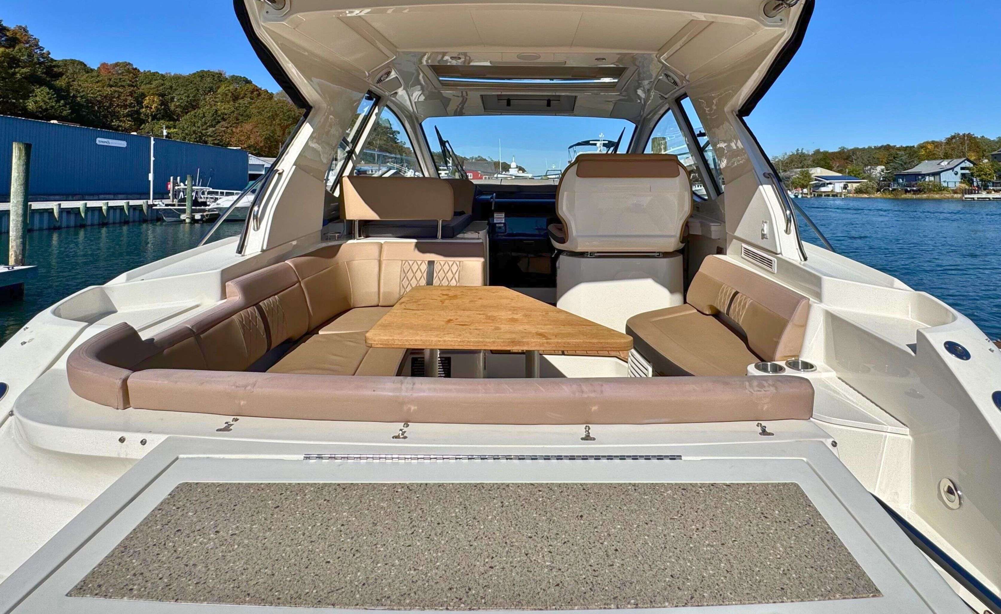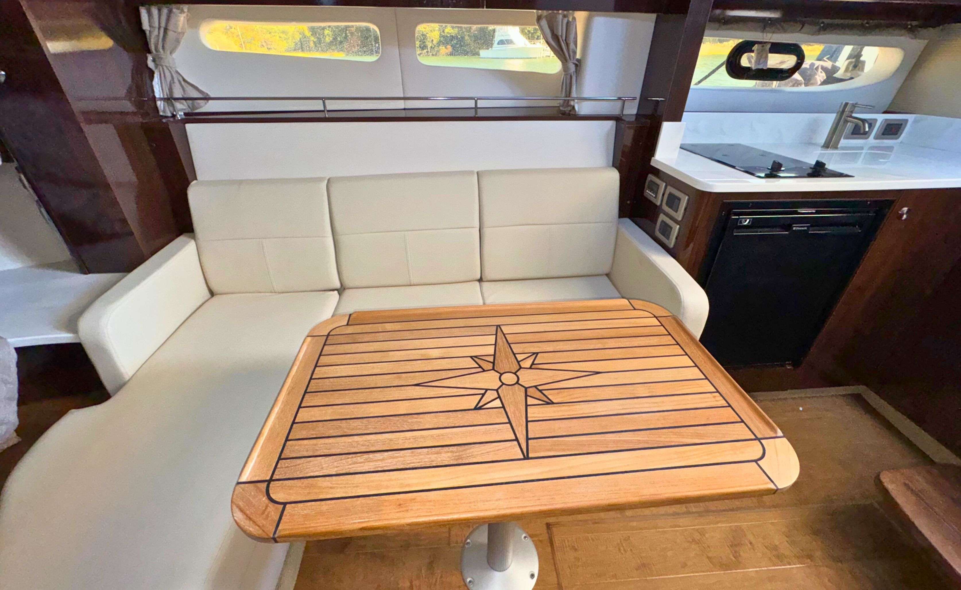 Designed for comfort and entertainment, the cockpit features a wrap-around bench seat, a Teak table, and an electrically actuated engine hatch. This boat also includes desirable upgrades such as: