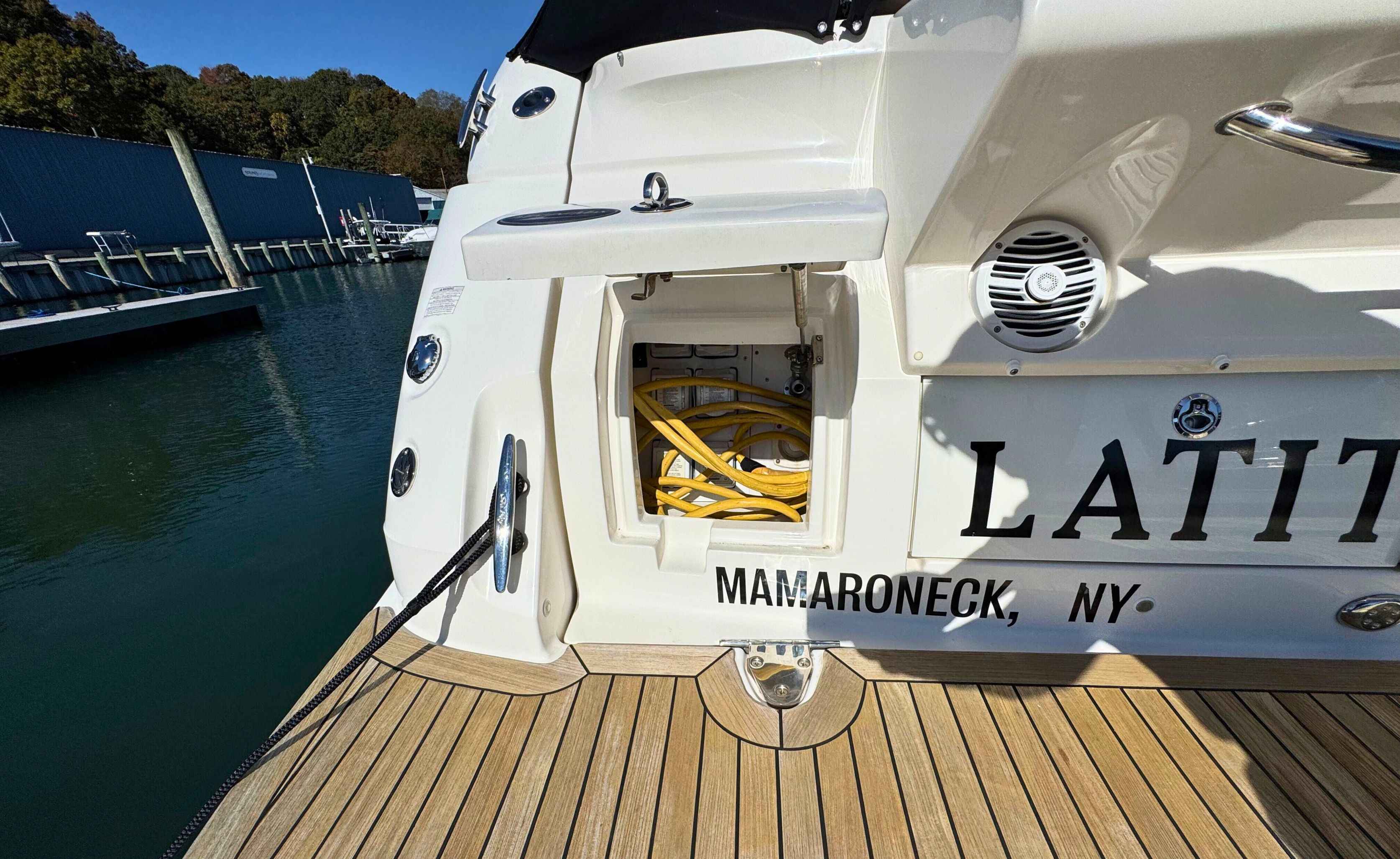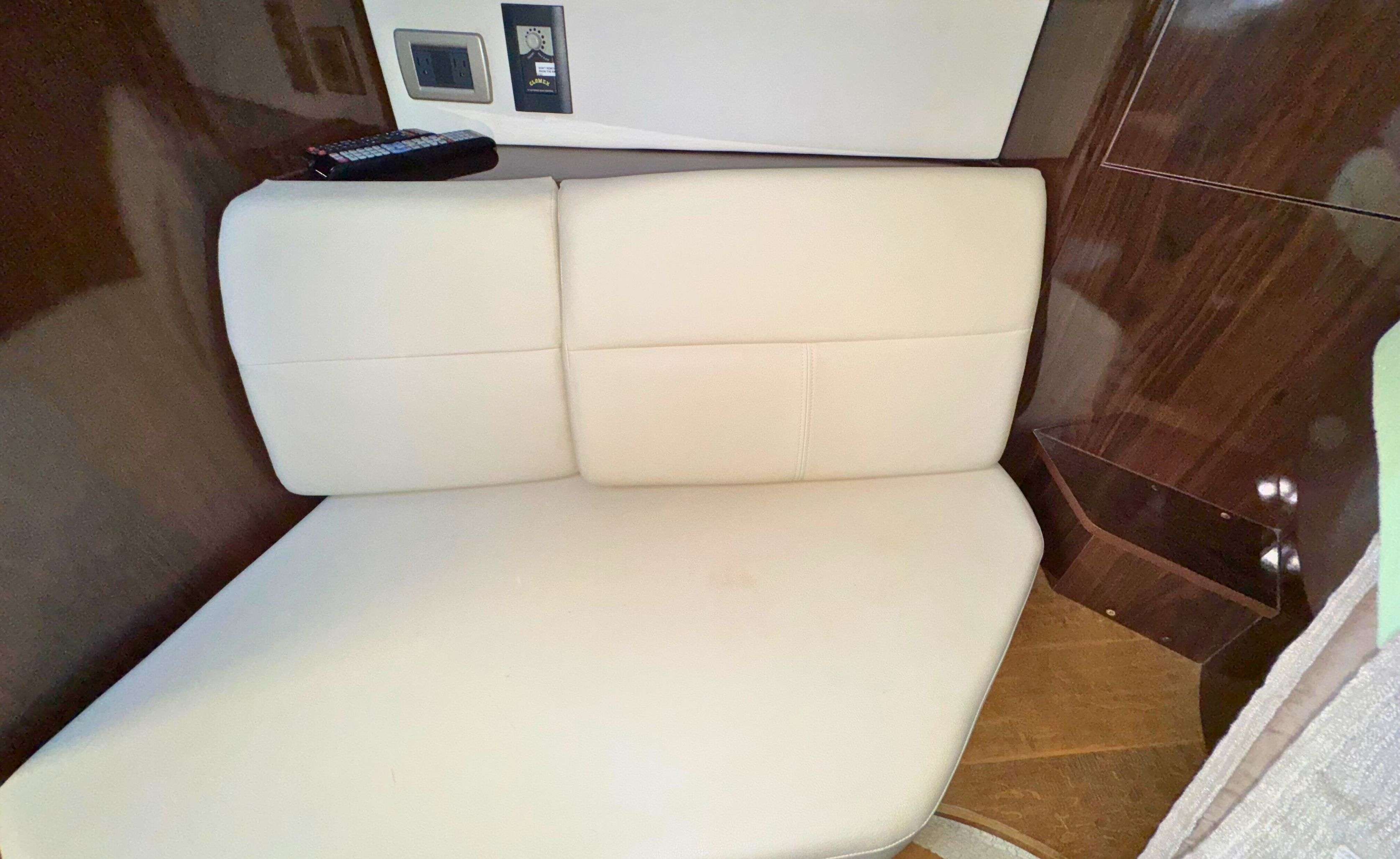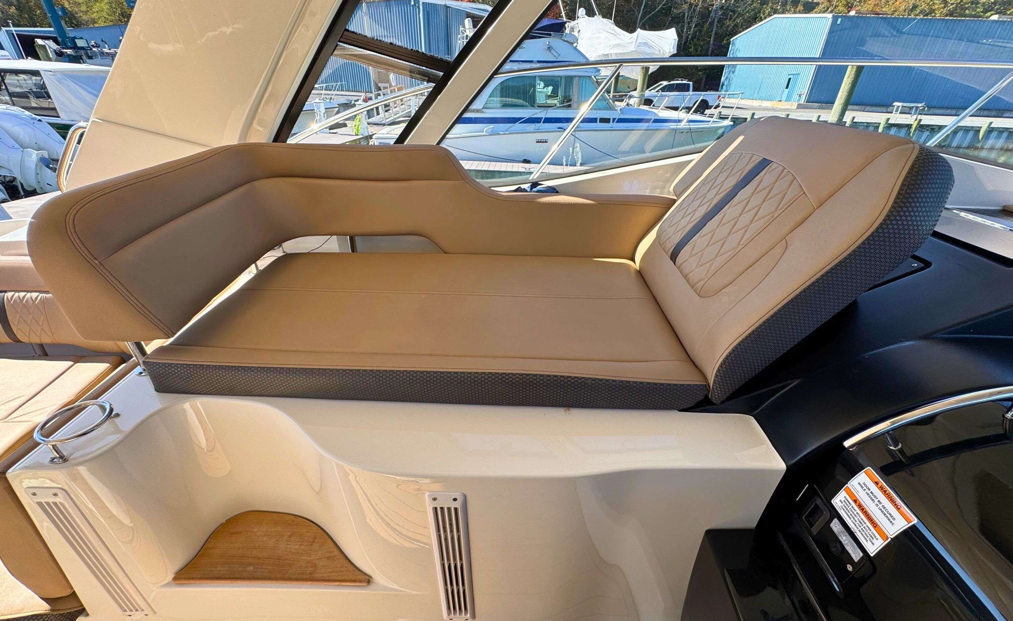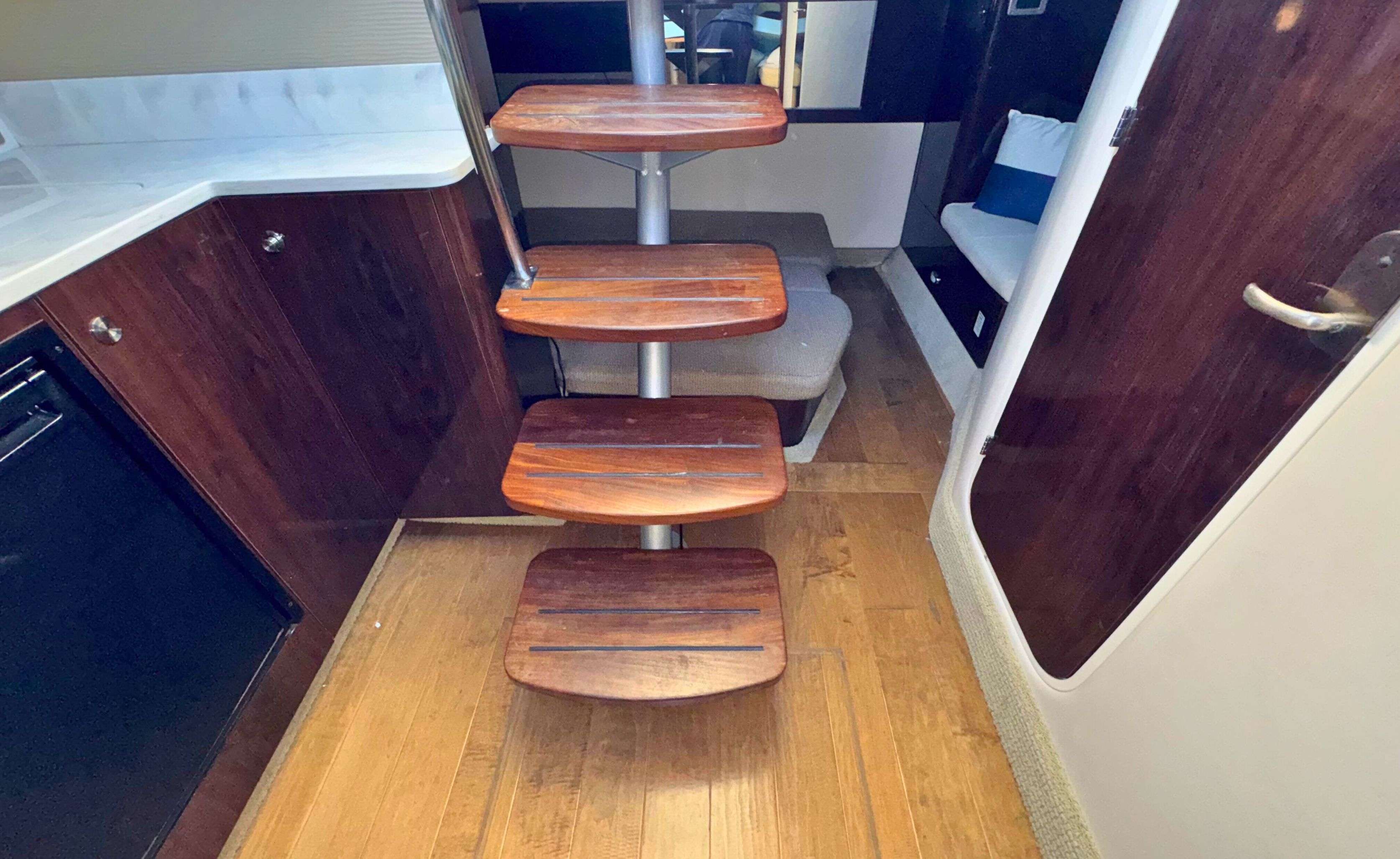 Designed for comfort and entertainment, the cockpit features a wrap-around bench seat, a Teak table, and an electrically actuated engine hatch. This boat also includes desirable upgrades such as: