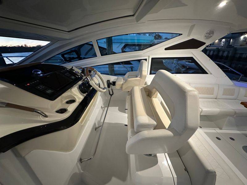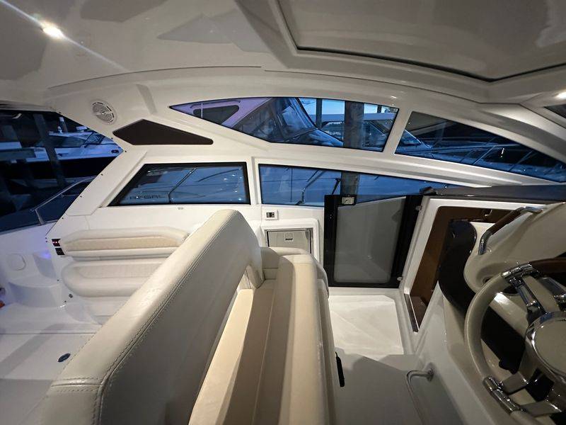 The sleek profile of the Gran Turismo 40, highlighted by a distinctive hardtop and elegant side glazing, accentuates her sporty and modern character. Powered by the latest-generation Air Step® hull, she provides exceptional handling, exhilarating performance, and a secure ride.