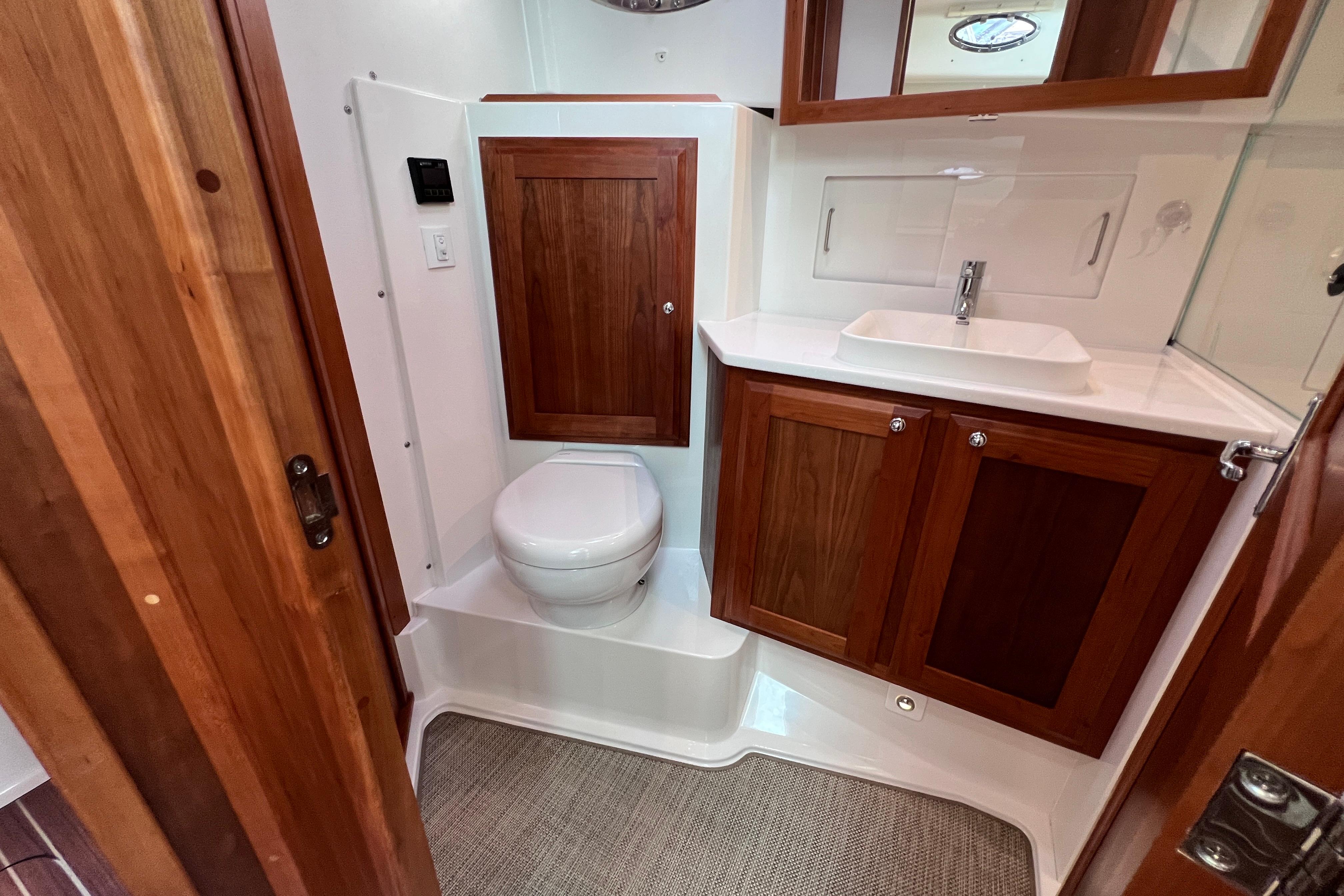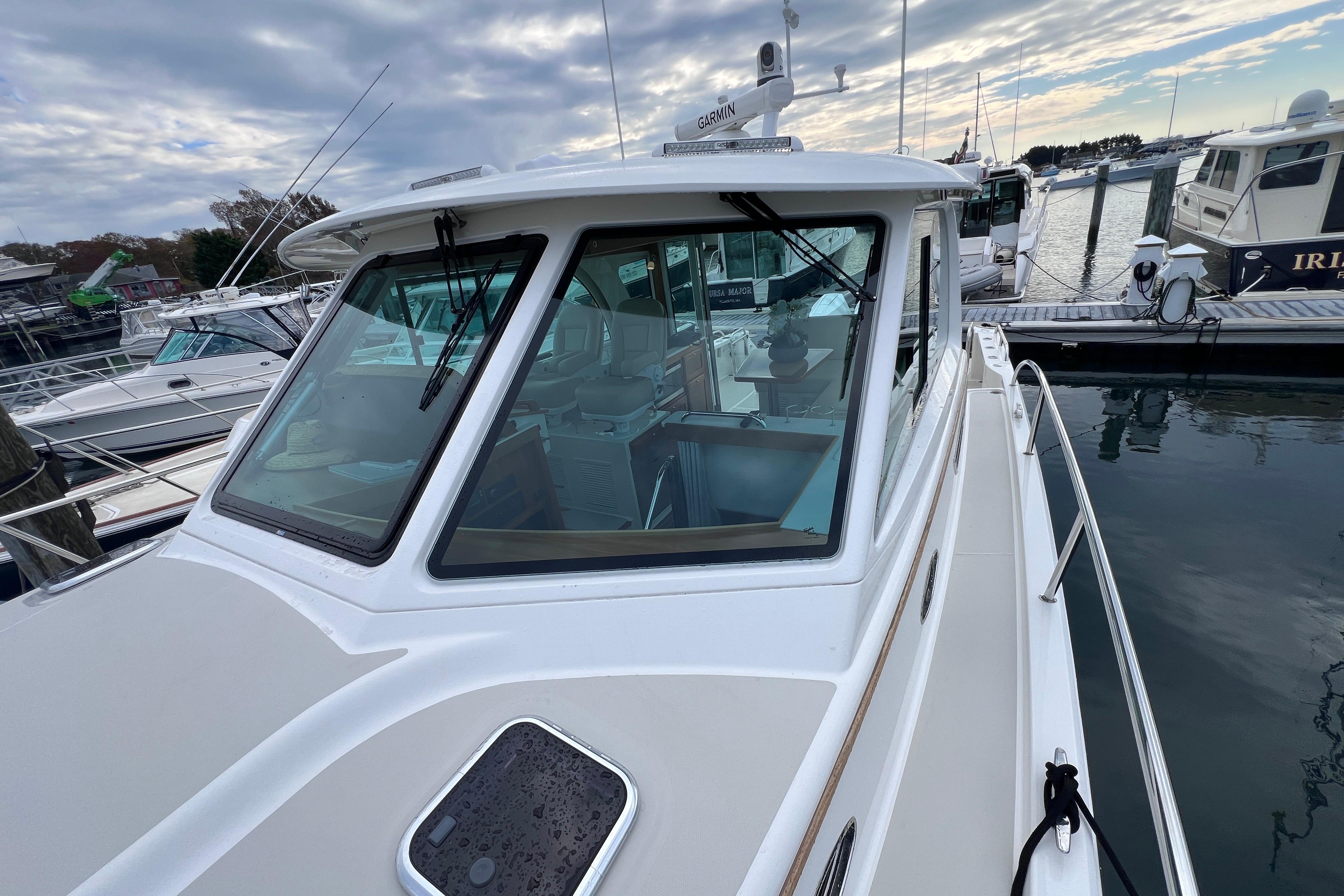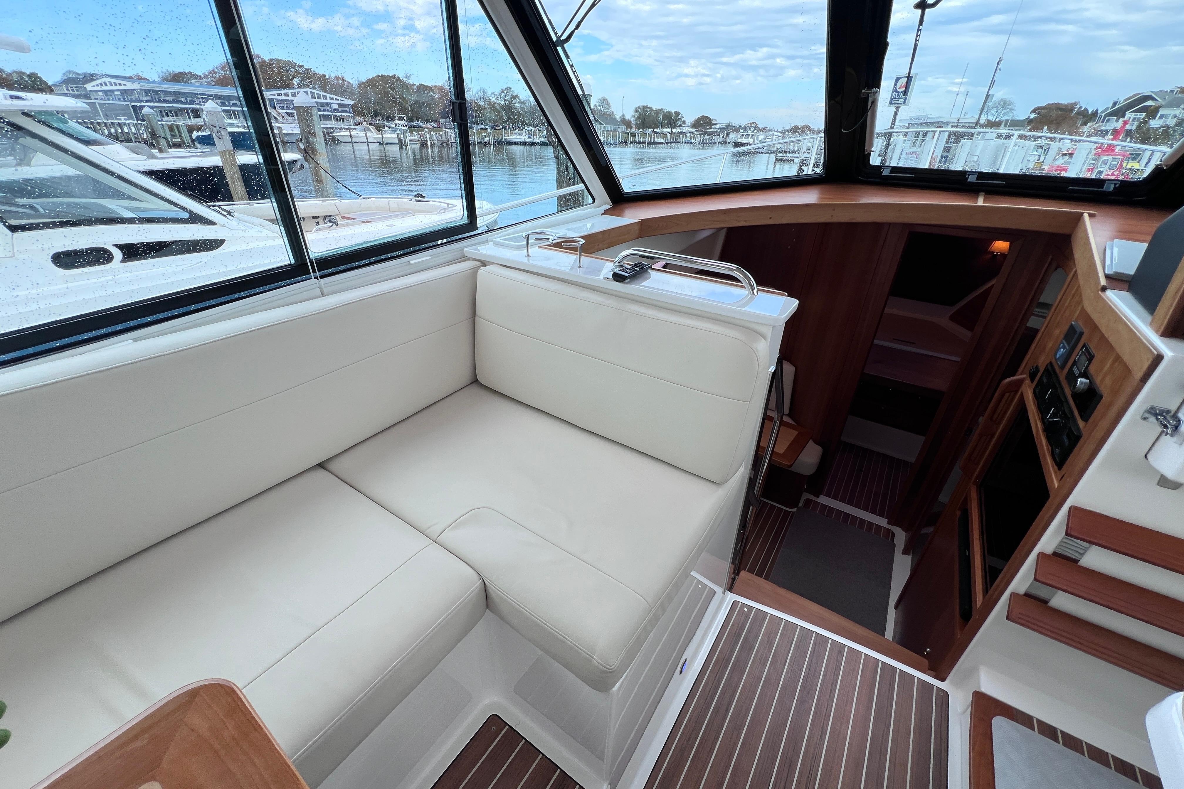 The hardback, fully enclosed helm deck sets a new standard in this segment, offering climate-controlled comfort and protection from the elements for an extended boating season. Inside, a galley-up layout keeps everyone connected, with side-by-side captain and mate seats facing a comfortable U-shaped settee.
