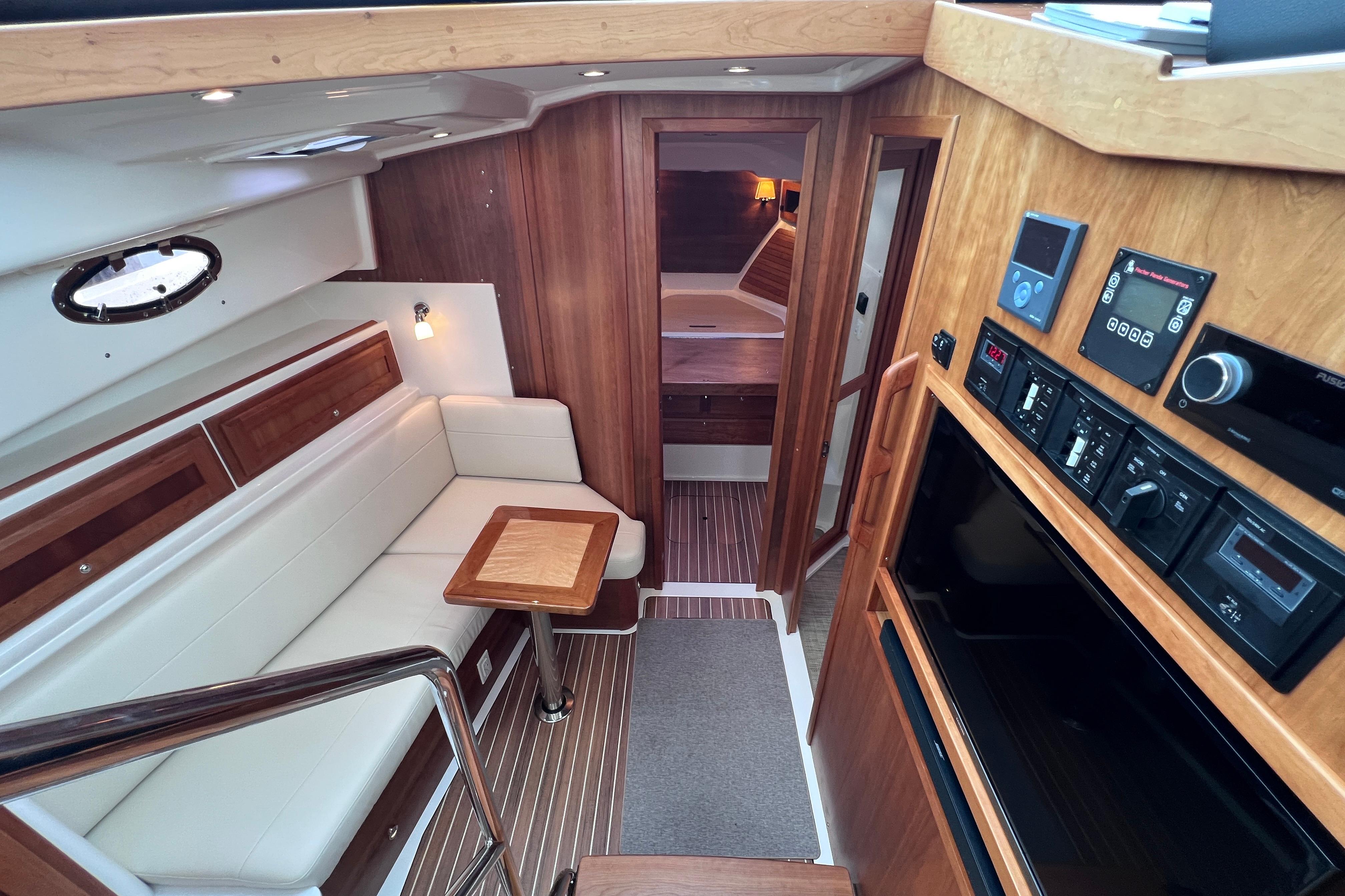 Her cockpit invites relaxation and fun, featuring port and starboard transom gates, a U-shaped settee, aft-facing seat, and central dining table—perfect for al fresco gatherings. A large actuated hatch reveals expansive under-deck storage for gear and water toys.