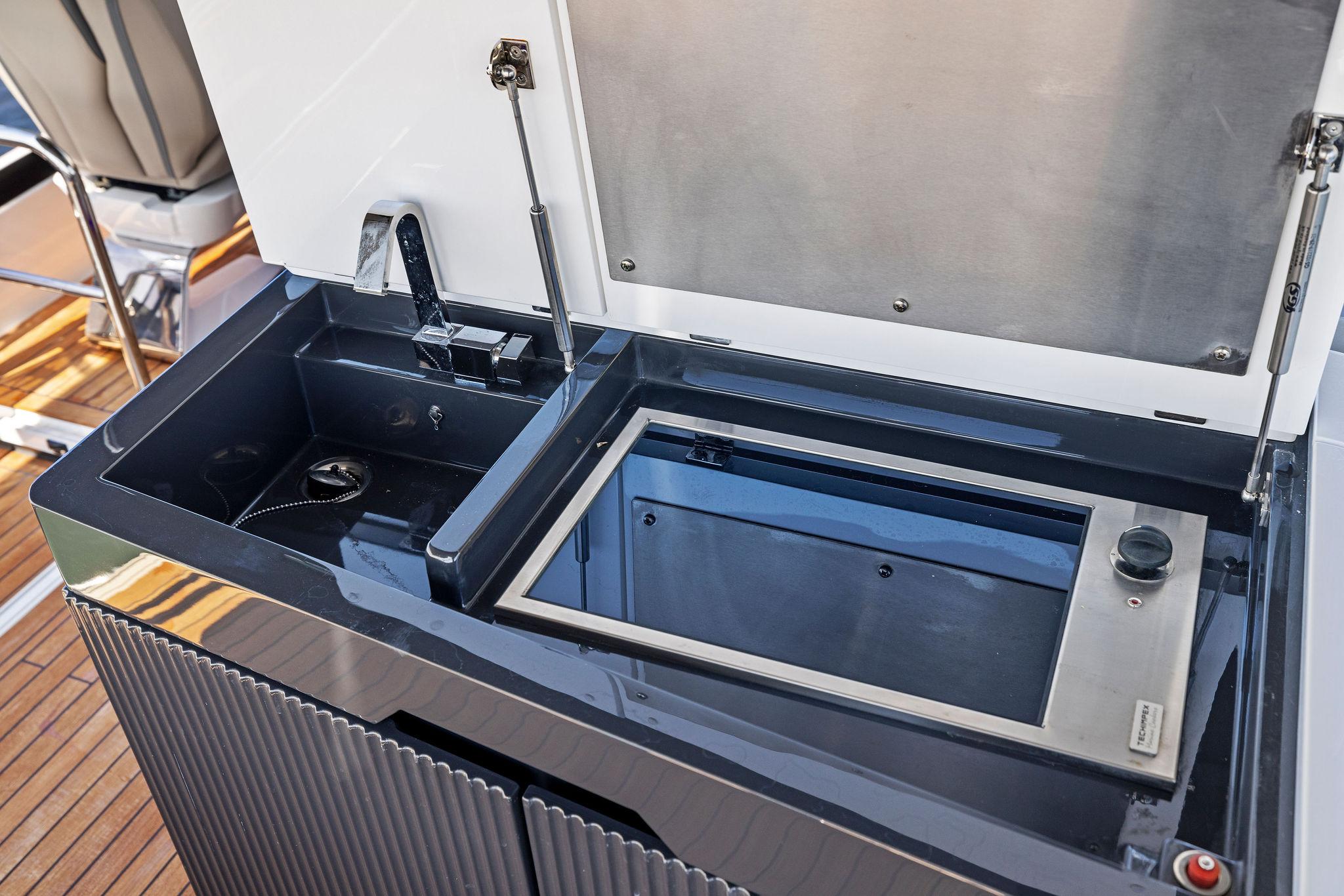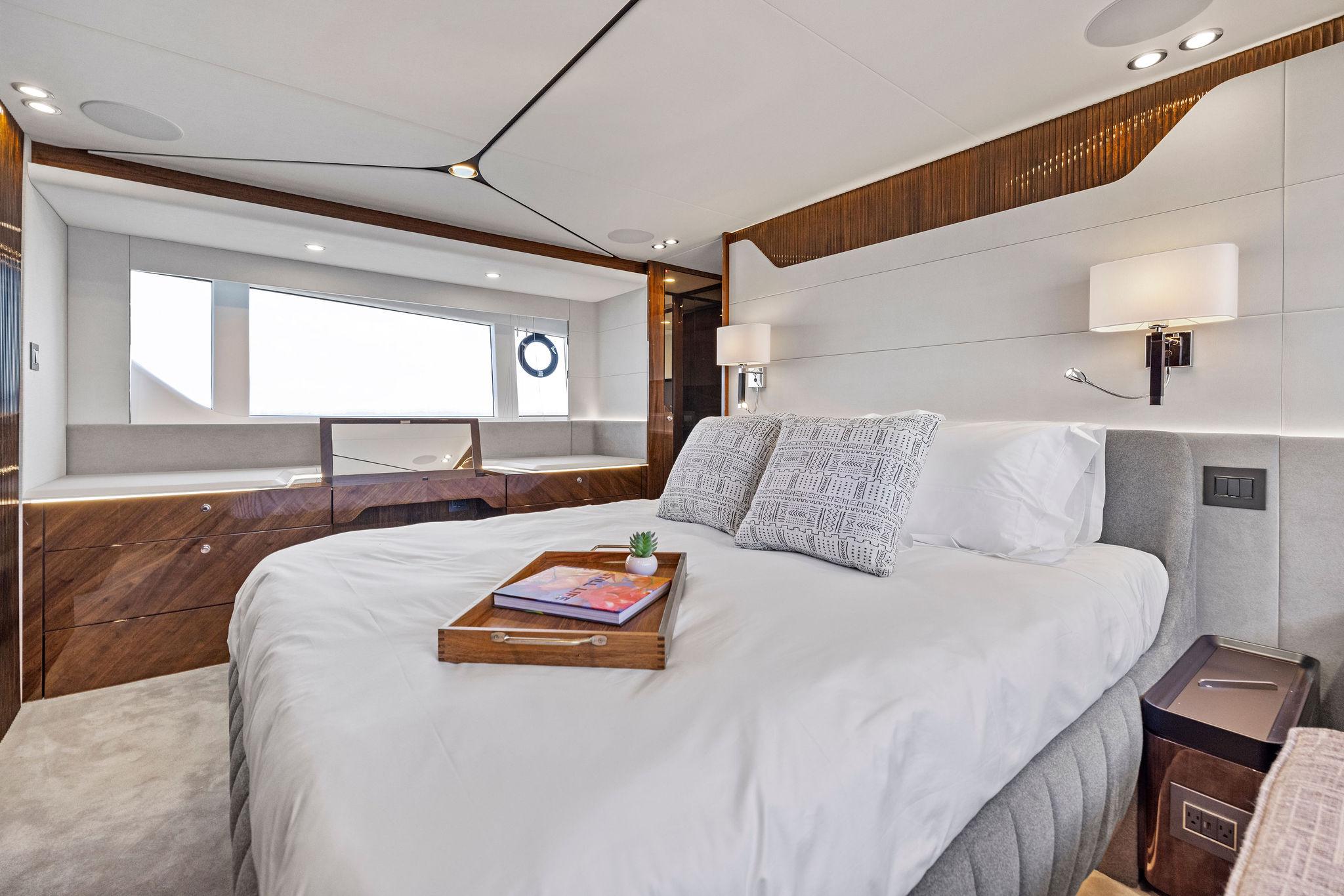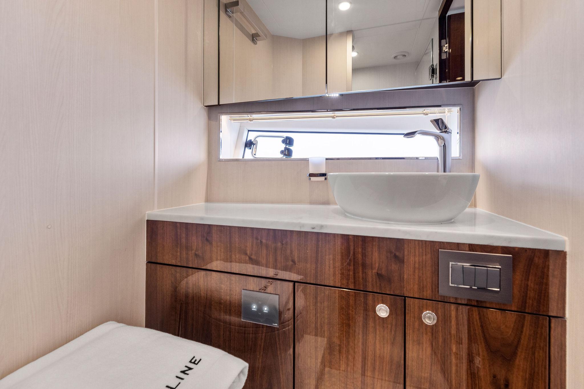 Step aboard and discover refined craftsmanship and innovation throughout — from the twin Caterpillar C32-1622 engines to the state-of-the-art Garmin navigation suite. Lounge beneath the hydraulic charcoal bimini, enjoy alfresco dining with a griddle and icemaker sportbridge bar, and unwind to the glow of customizable underwater RGB lighting.