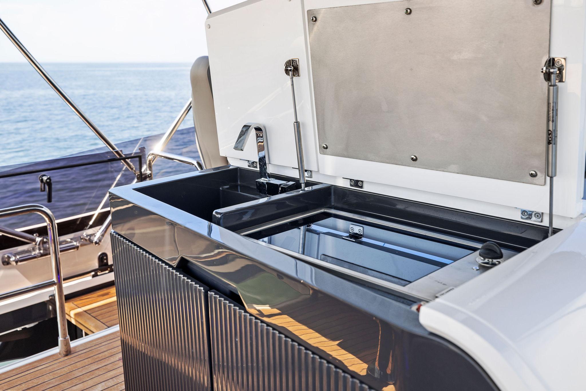 With thoughtful touches like side boarding gates, freshwater and anchor wash systems, teak decking, and a tender garage, the Phantom 65 is built for effortless adventure.