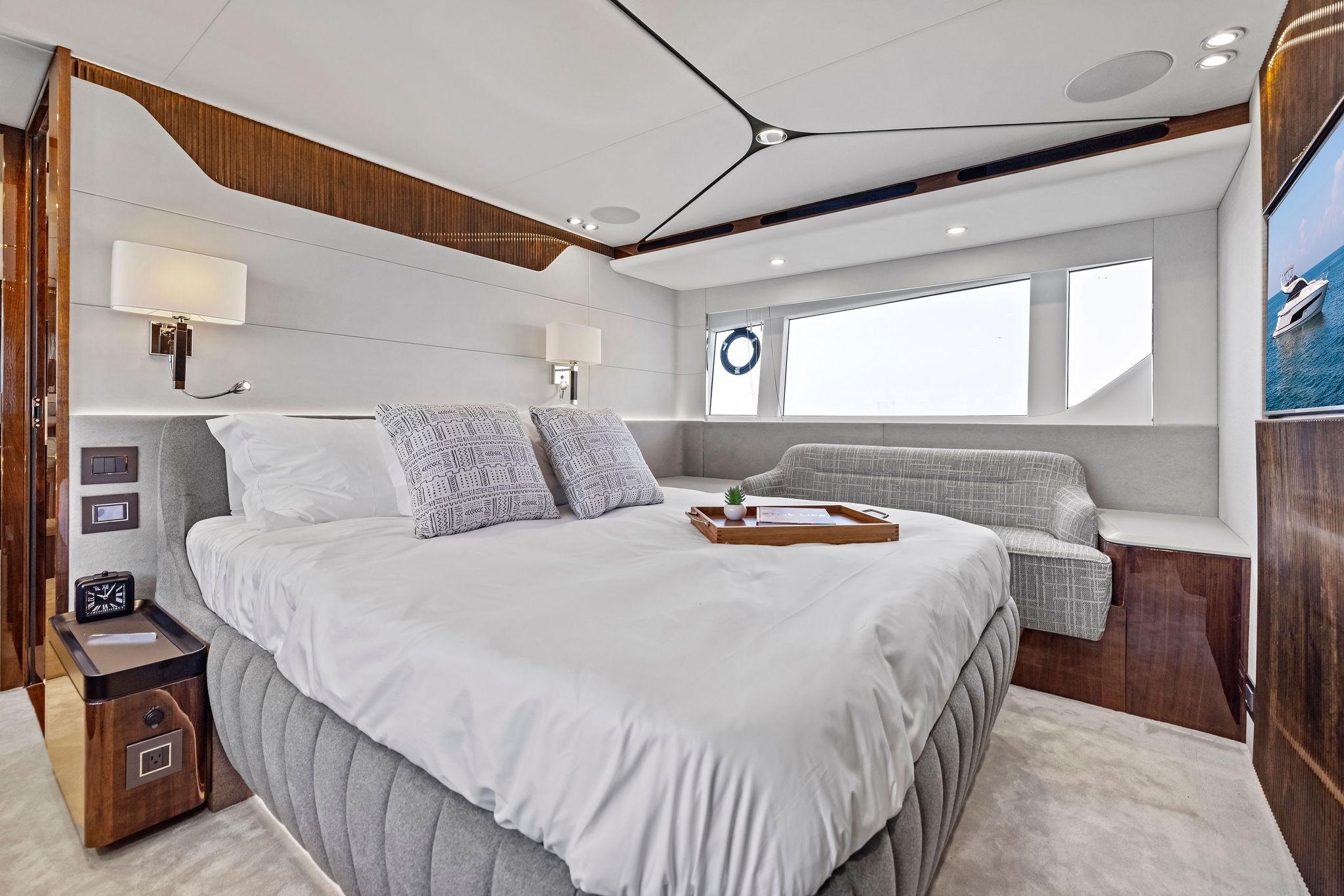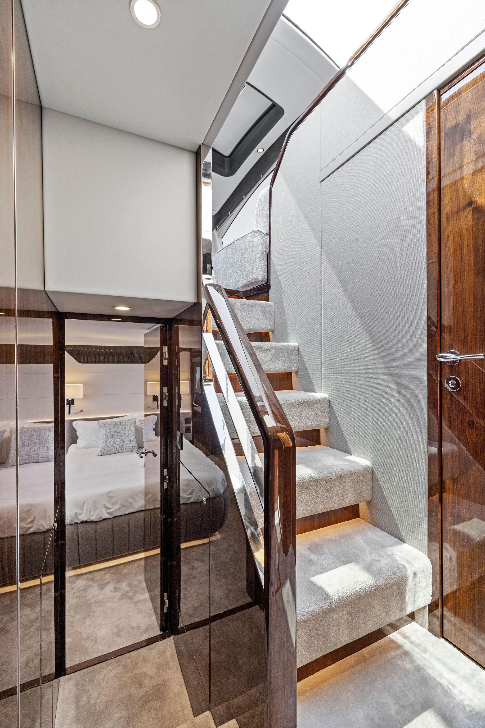 Inside, sophistication meets comfort with premium materials and upgraded finishes: walnut gloss timber, oak flooring, bespoke upholstery, and mood lighting throughout. The three-cabin layout with extended VIP suite and private crew quarters ensure every guest experiences unmatched elegance and privacy.